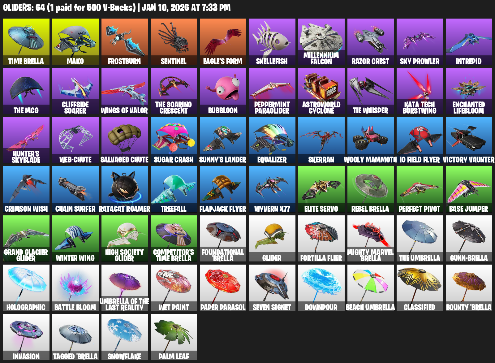 Mako, Time Brella, Frostburn, Sentinel, Eagle’s Form, Skellefish, Millennium Falcon, Razor Crest, Sky Prowler, Intrepid, Cliffside Soarer, Bubbloon, Astroworld Cyclone, TIE Whisper, Kata Tech Burstwing, Enchanted Lifebloom