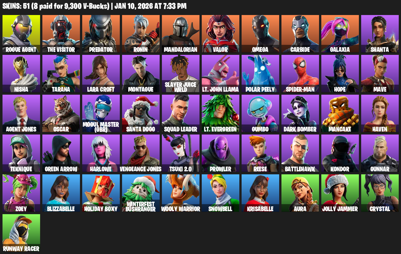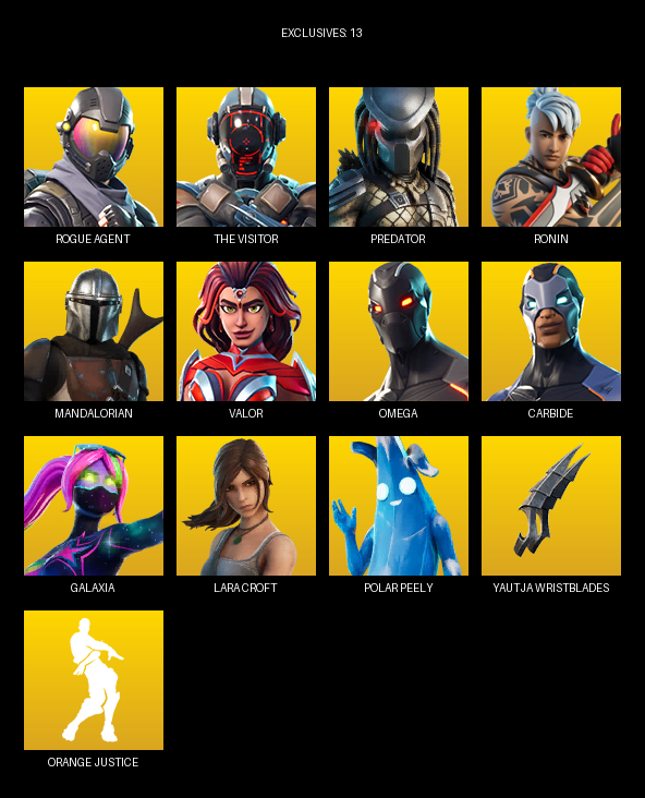 Omega, Lara Croft, Rogue Agent, The Visitor, Predator, Ronin, Mandalorian, Valor, Carbide, Galaxia, Shanta, Nisha, Tarana, Montague, Slayer Juice WRLD, Lt. John Llama, Polar Peely, Spider-Man, Hope, Mave