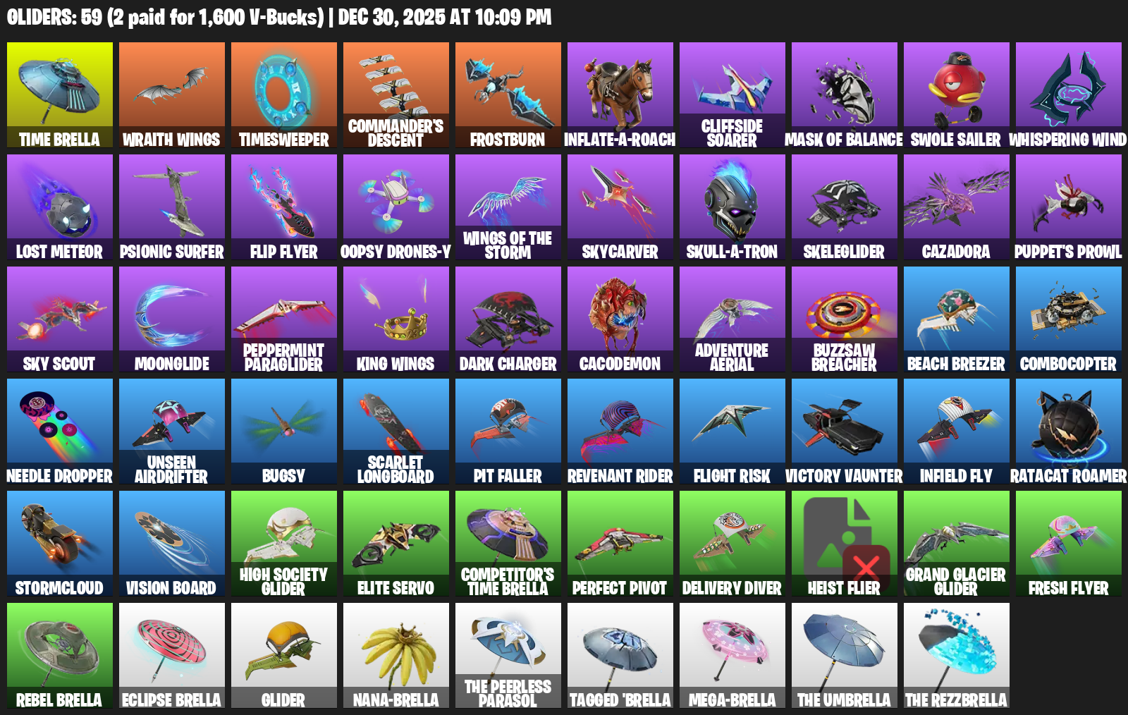 Time Brella, Wraith Wings, Timesweeper, Commander’s Descent, Frostburn, Cliffside Soarer, Swole Sailer, Whispering Wind, Lost Meteor, Psionic Surfer, Flip Flyer, Oopsy Drones-y, Skycarver, Skeleglider, Cazadora, Puppet’s Prowl