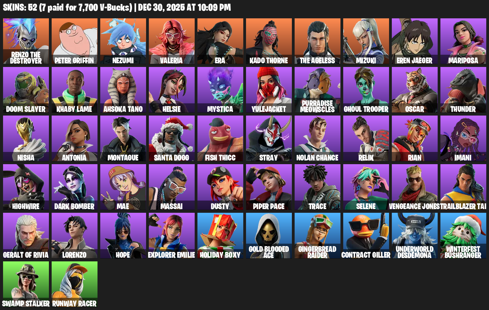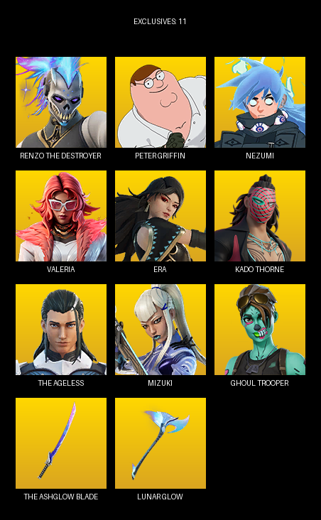 Renzo the Destroyer, Peter Griffin, Nezumi, Valeria, Era, Kado Thorne, Mizuki, Eren Jaeger, Mariposa, Doom Slayer, Khaby Lame, Ahsoka Tano, Helsie, Mystica, Yulejacket, Purradise Meowscles, Ghoul Trooper, Oscar, Thunder