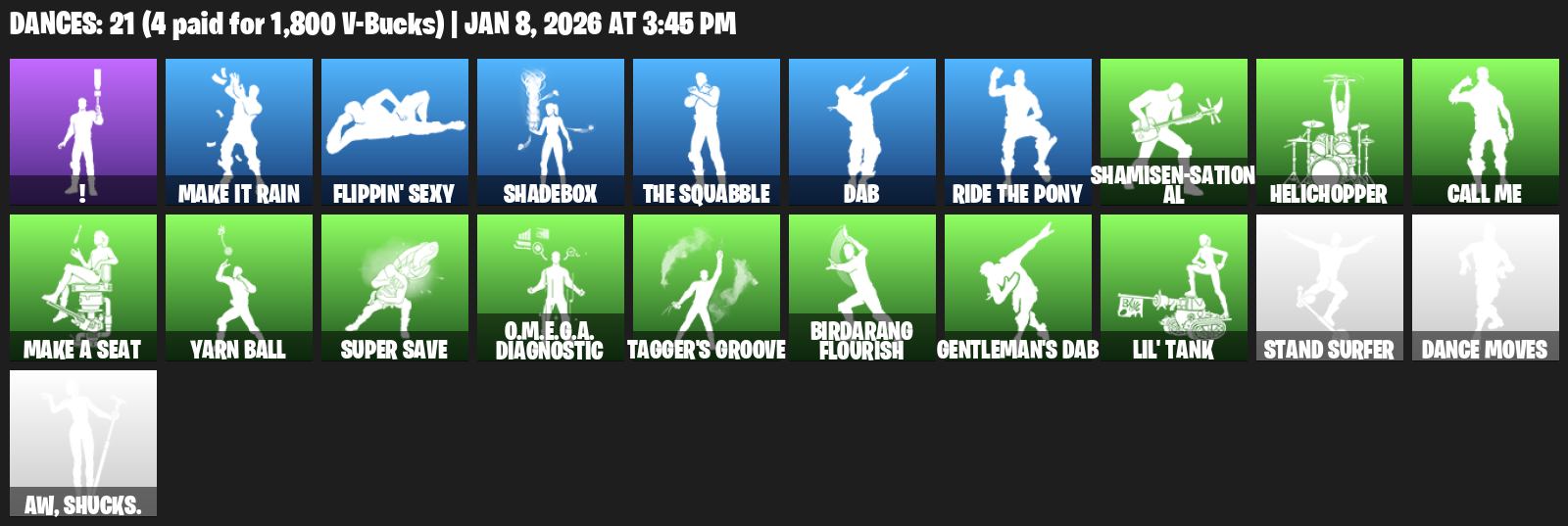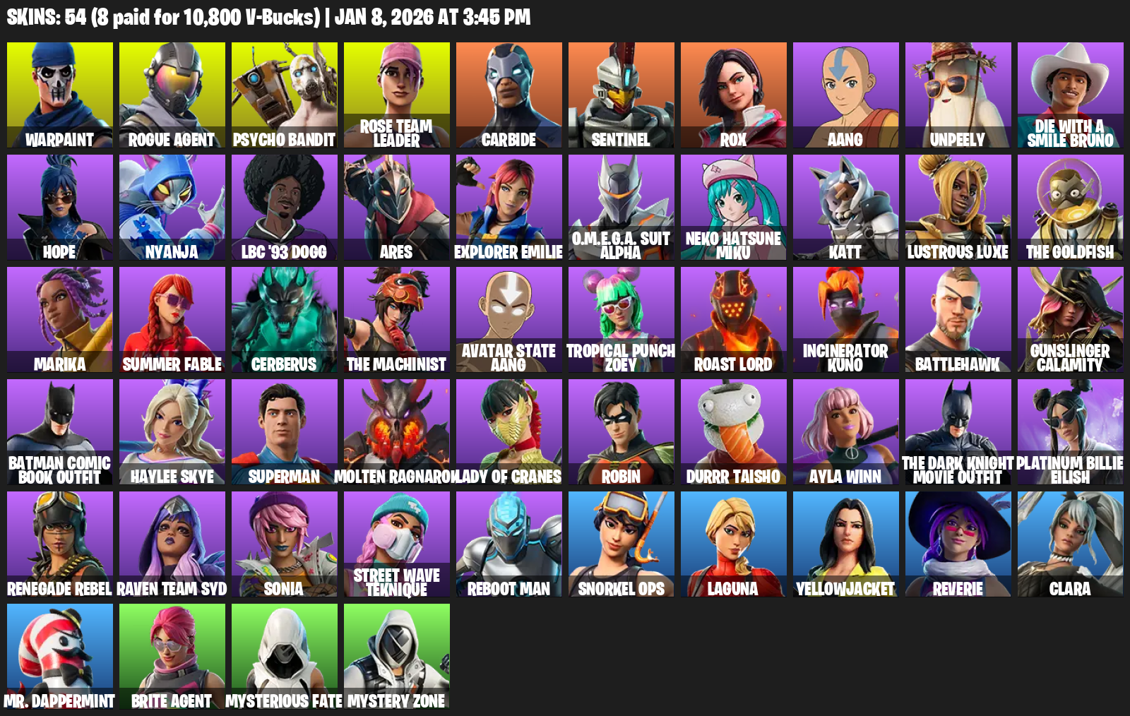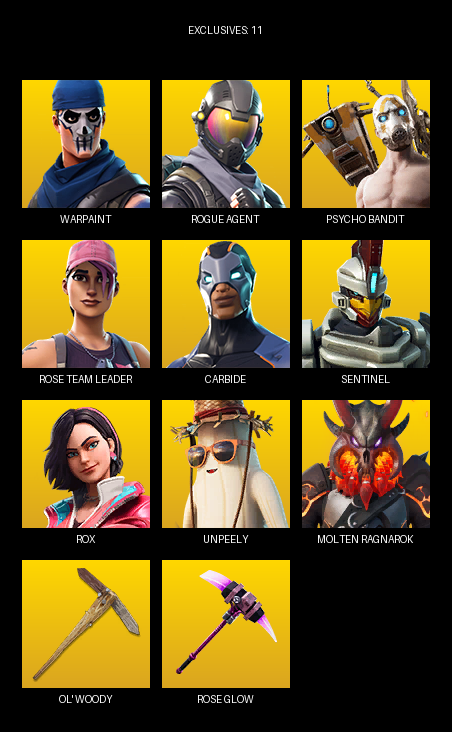 Warpaint, Rogue Agent, Psycho Bandit, Rose Team Leader, Carbide, Sentinel, Rox, Aang, Unpeely, Die With A Smile Bruno, Hope, Nyanja, LBC ’93 Dogg, Ares, Explorer Emilie, O.M.E.G.A. Suit Alpha, Neko Hatsune Miku, Katt, Lustrous Luxe, The Goldfish