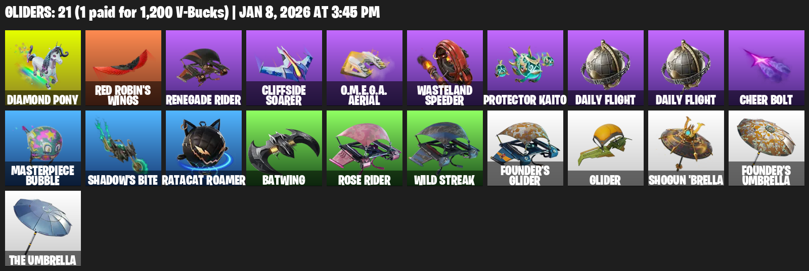 Diamond Pony, Renegade Rider, Cliffside Soarer, Wasteland Speeder, Protector Kaito, Daily Flight, Cheer Bolt, Shadow’s Bite, Ratacat Roamer, Batwing, Wild Streak, Founder’s Glider, Shogun ‘Brella
