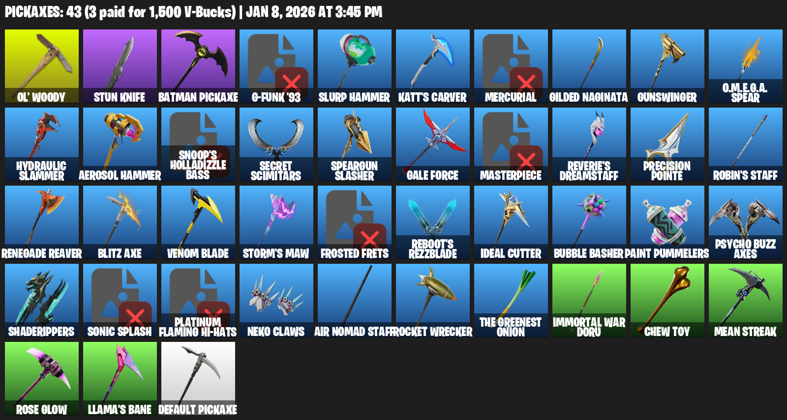 Ol’ Woody, Stun Knife, Batman Pickaxe, SLURP Hammer, Katt’s Carver, Mercurial, Gilded Naginata, Gunswinger, Hydraulic Slammer, Snoop’s Holladizzle Bass, Secret Scimitars, Speargun Slasher, Gale Force, Masterpiece, Reverie’s Dreamstaff, Precision Pointe, Robin’s Staff