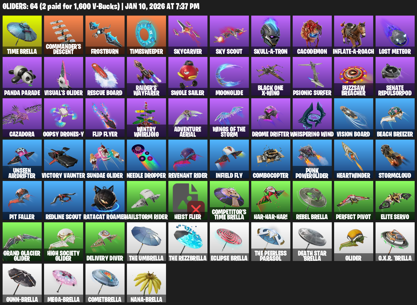 Time Brella, Commander’s Descent, Frostburn, Timesweeper, Skycarver, Sky Scout, Cacodemon, Lost Meteor, Panda Parade, Visual’s Glider, Rescue Board, Raider’s Wayfarer, Swole Sailer, Moonglide, Psionic Surfer, Buzzsaw Breacher, Senate Repulsorpod