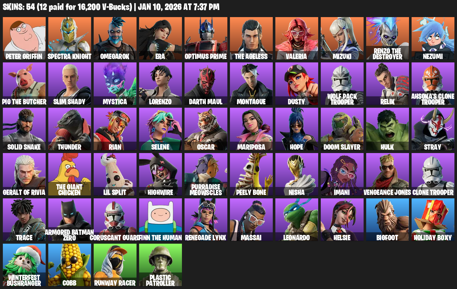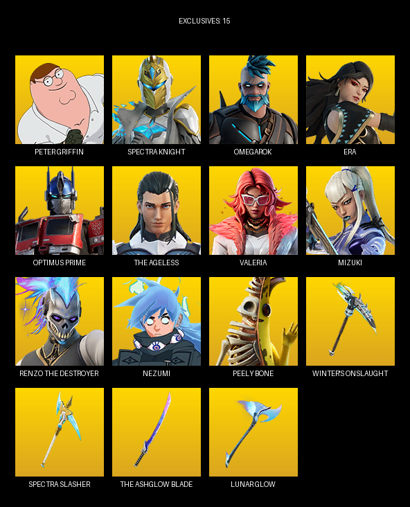 Peter Griffin, Spectra Knight, Omegarok, Era, Optimus Prime, The Ageless, Valeria, Mizuki, Nezumi, Slim Shady, Mystica, Lorenzo, Darth Maul, Montague, Dusty, Wolf Pack Trooper, Relik