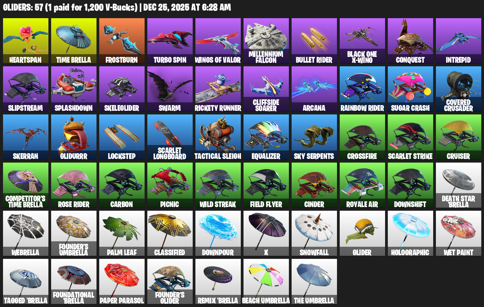 Heartspan, Time Brella, Frostburn, Turbo Spin, Millennium Falcon, Bullet Rider, Black One X-wing, Conquest, Intrepid, Slipstream, Splashdown, Skeleglider, Swarm, Rickety Runner, Cliffside Soarer, Arcana, Sugar Crash, Covered Crusader
