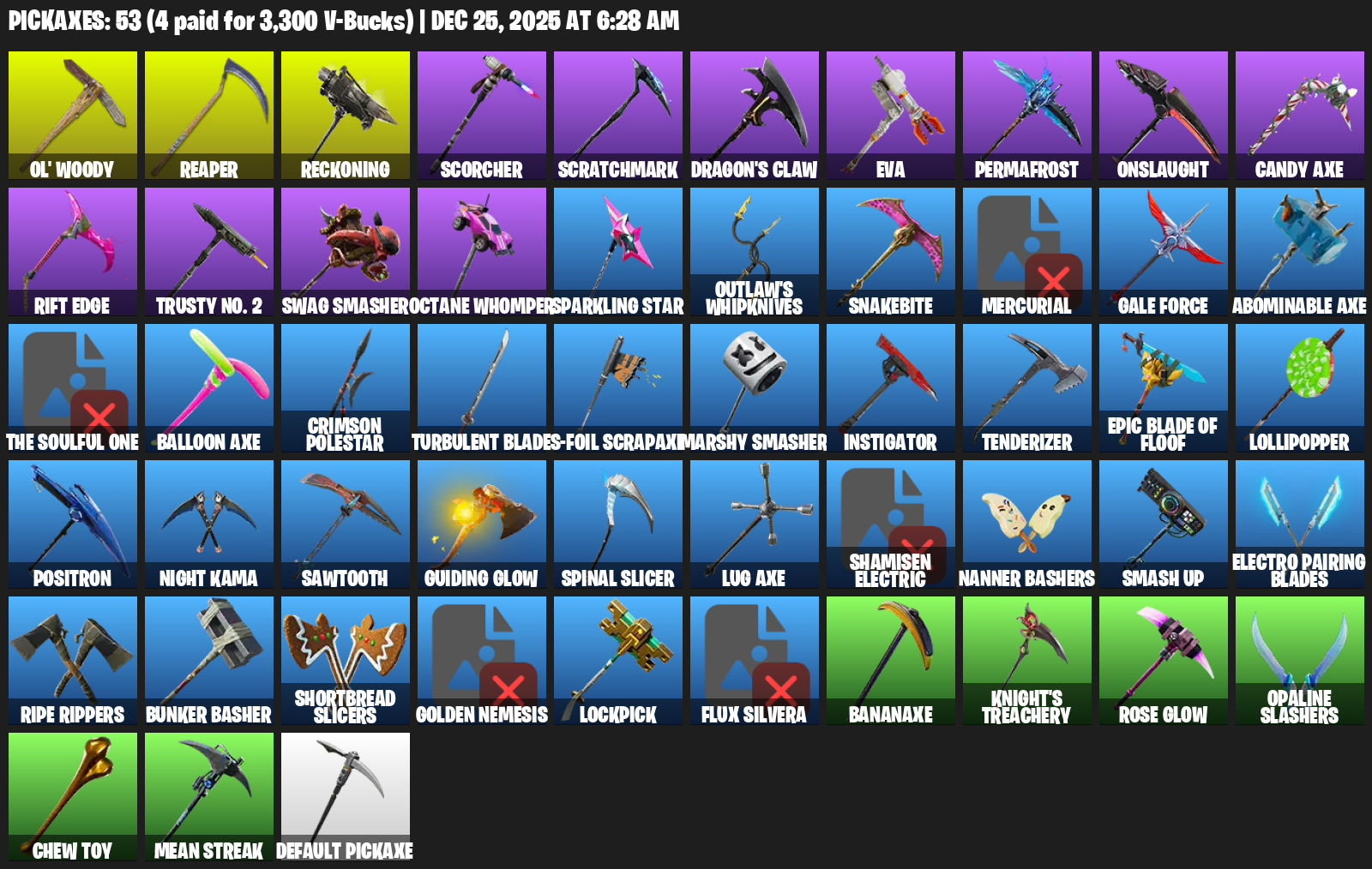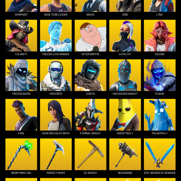 Ol’ Woody, Reckoning, Scorcher, Scratchmark, Dragon’s Claw, EVA, Permafrost, Onslaught, Candy Axe, Rift Edge, Trusty No. 2, Swag Smasher, Octane Whomper, Sparkling Star, Outlaw’s Whipknives, Snakebite, Mercurial, Gale Force