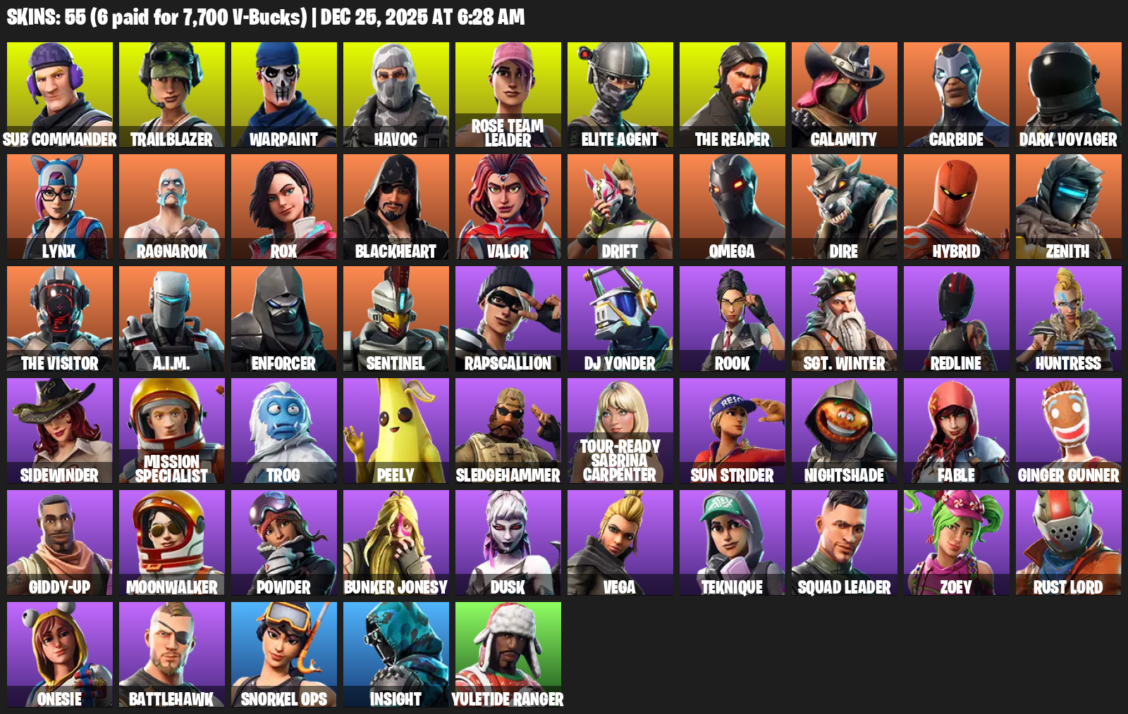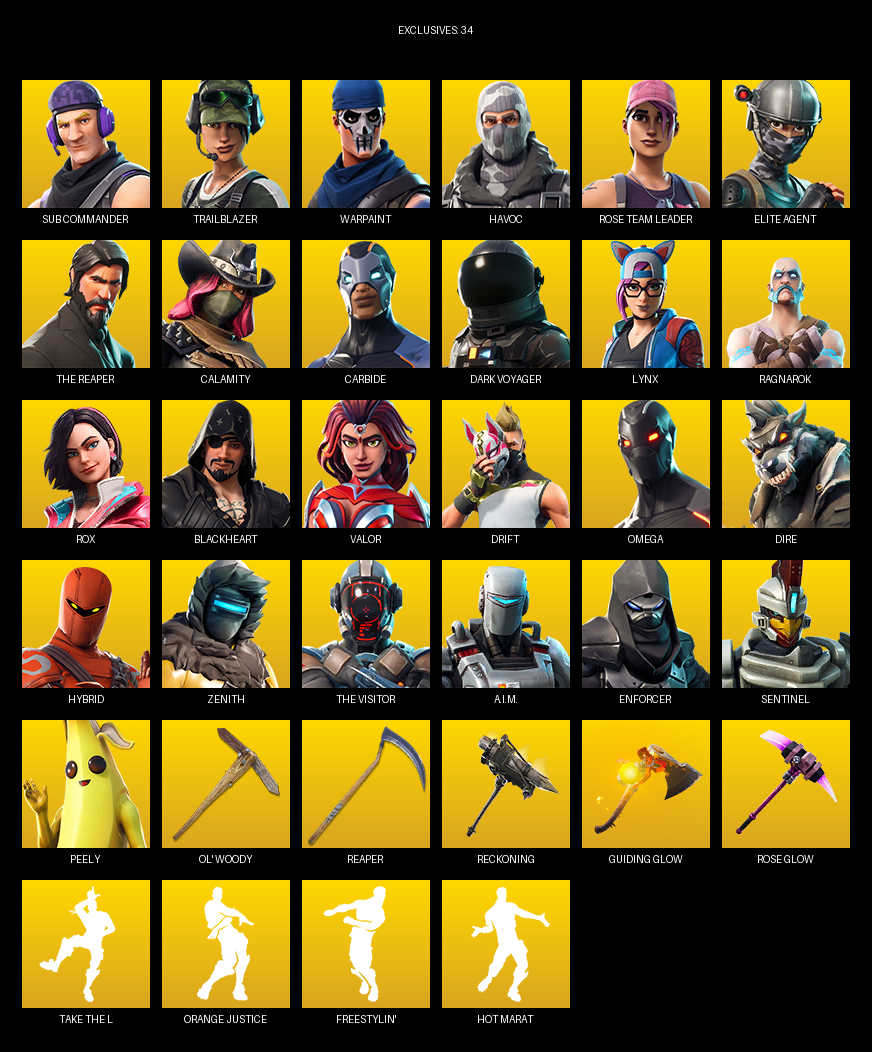 Elite Agent, The Reaper, Omega, Sub Commander, Trailblazer, Warpaint, Havoc, Rose Team Leader, Calamity, Carbide, Dark Voyager, Lynx, Ragnarok, Rox, Blackheart, Valor, Drift, Dire, Hybrid, Zenith