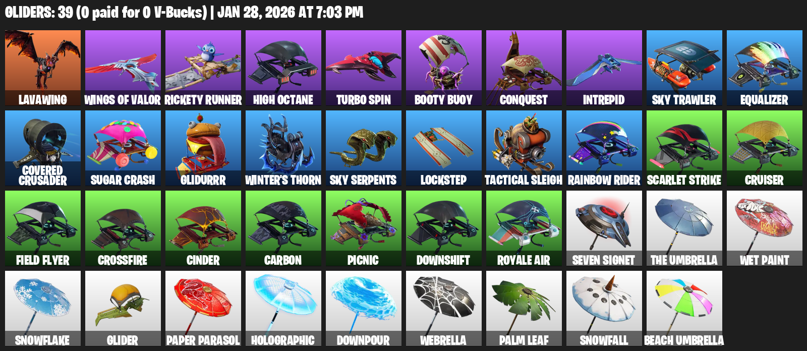 Lavawing, Rickety Runner, High Octane, Turbo Spin, Booty Buoy, Conquest, Intrepid, Sky Trawler, Equalizer, Covered Crusader, Sugar Crash, Glidurrr, Winter’s Thorn, Lockstep, Tactical Sleigh, Rainbow Rider, Scarlet Strike, Cruiser