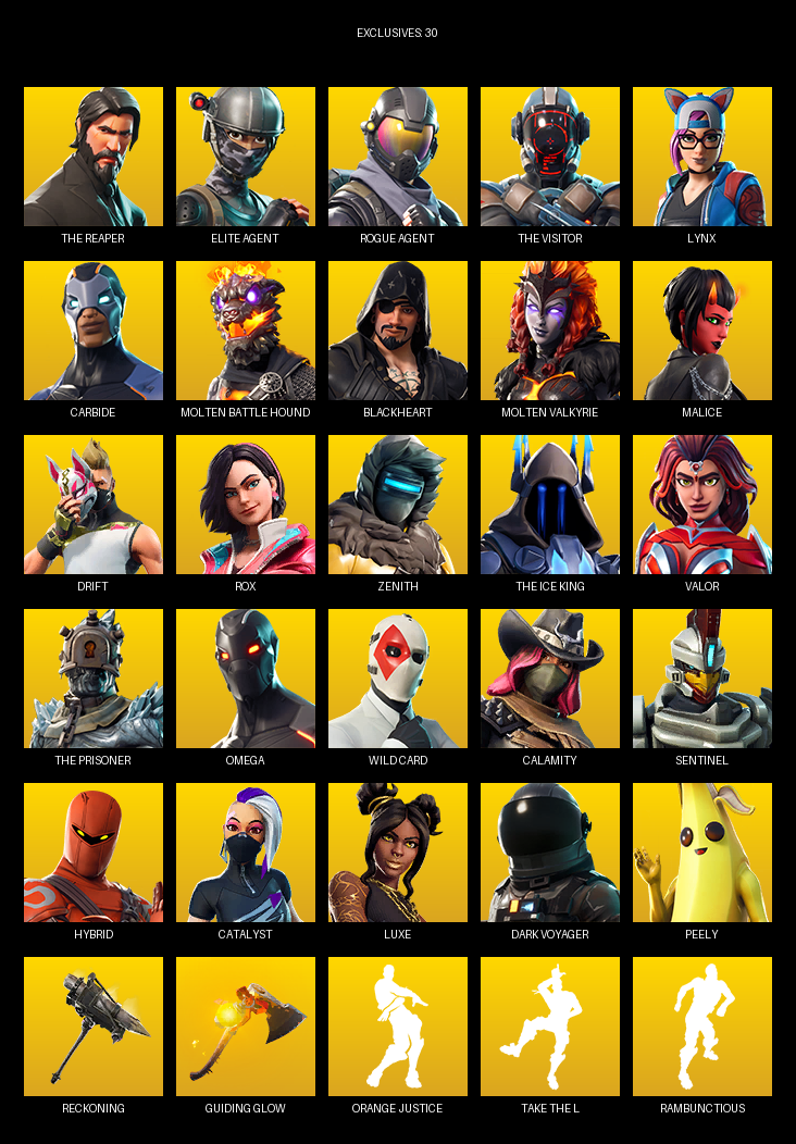 The Reaper, Elite Agent, Omega, Lynx, Carbide, Molten Battle Hound, Blackheart, Malice, Drift, Rox, Zenith, Valor, Wild Card, Calamity, Sentinel