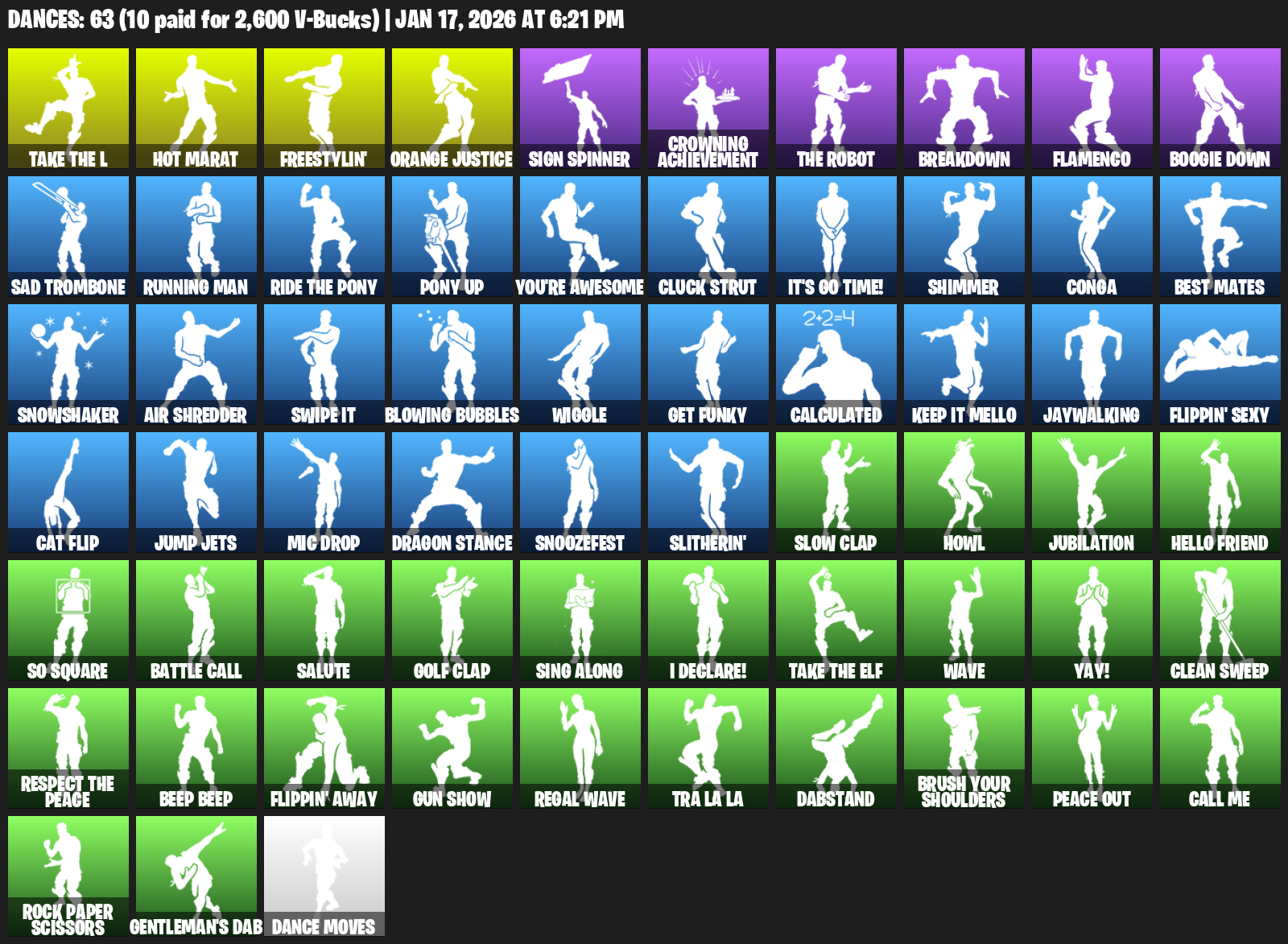 Hot Marat, Freestylin’, Orange Justice, Sign Spinner, Crowning Achievement, Breakdown, Flamenco, Boogie Down, Sad Trombone, Running Man, Pony Up, You’re Awesome, Cluck Strut, It’s Go Time!, Shimmer, Conga, Best Mates