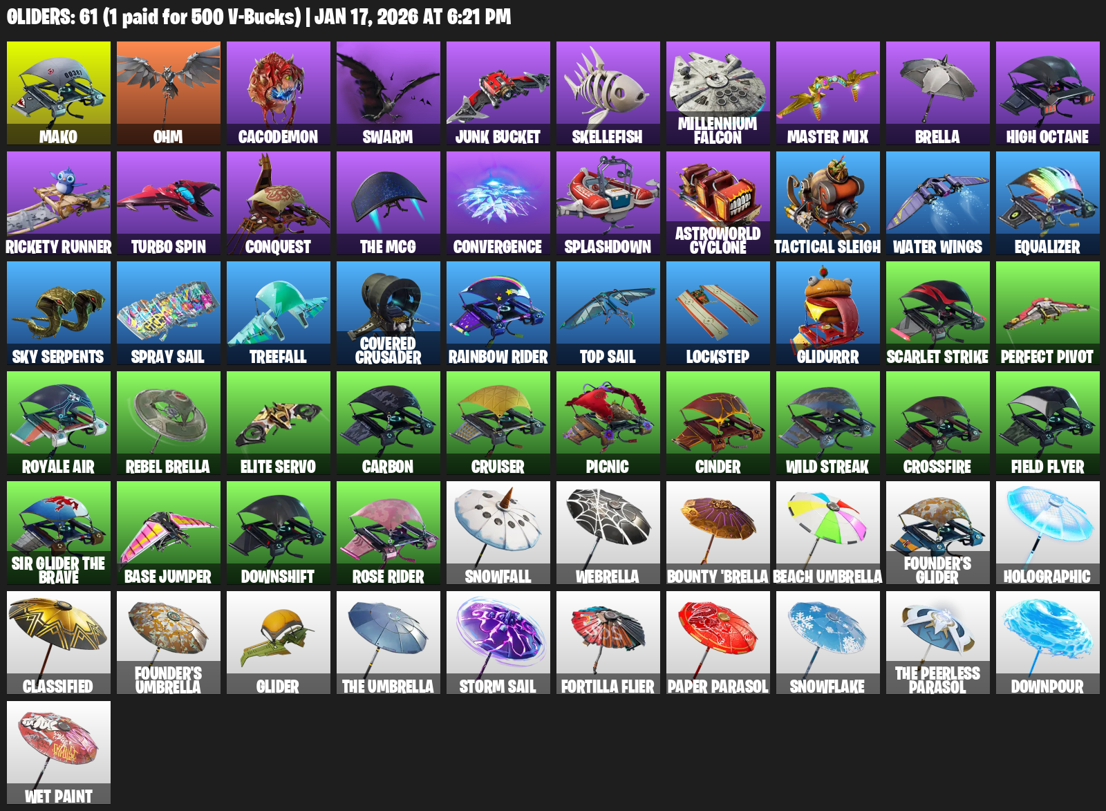Mako, Ohm, Cacodemon, Swarm, Junk Bucket, Skellefish, Millennium Falcon, Master Mix, Brella, High Octane, Rickety Runner, Turbo Spin, Conquest, Convergence, Splashdown, Astroworld Cyclone, Tactical Sleigh, Water Wings, Equalizer