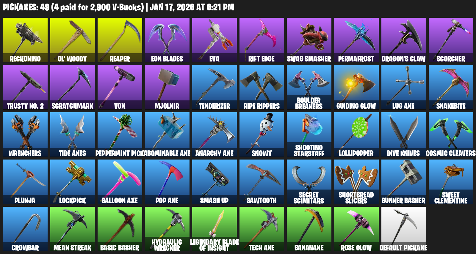 Reckoning, Ol’ Woody, Eon Blades, EVA, Rift Edge, Swag Smasher, Permafrost, Dragon’s Claw, Scorcher, Trusty No. 2, Scratchmark, Vox, Mjolnir, Tenderizer, Ripe Rippers, Boulder Breakers, Guiding Glow, Lug Axe, Snakebite