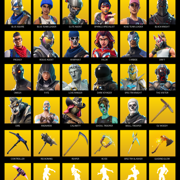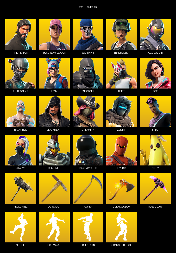 The Reaper, Elite Agent, Rose Team Leader, Warpaint, Trailblazer, Lynx, Enforcer, Drift, Rox, Ragnarok, Blackheart, Calamity, Zenith, Fade, Catalyst, Sentinel, Dark Voyager, Hybrid, Dusk