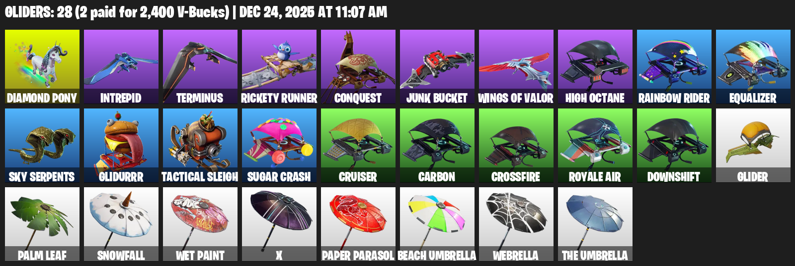Diamond Pony, Intrepid, Terminus, Rickety Runner, Conquest, Junk Bucket, High Octane, Equalizer, Sky Serpents, Glidurrr, Tactical Sleigh, Sugar Crash, Cruiser, Carbon, Crossfire, Royale Air, Downshift, Glider