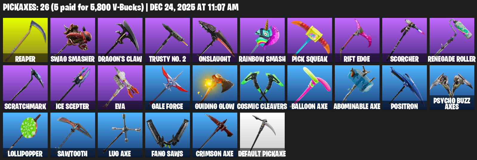 Swag Smasher, Dragon’s Claw, Trusty No. 2, Onslaught, Rainbow Smash, Pick Squeak, Rift Edge, Scorcher, Renegade Roller, Scratchmark, Ice Scepter, EVA, Gale Force, Guiding Glow, Cosmic Cleavers, Balloon Axe, Positron