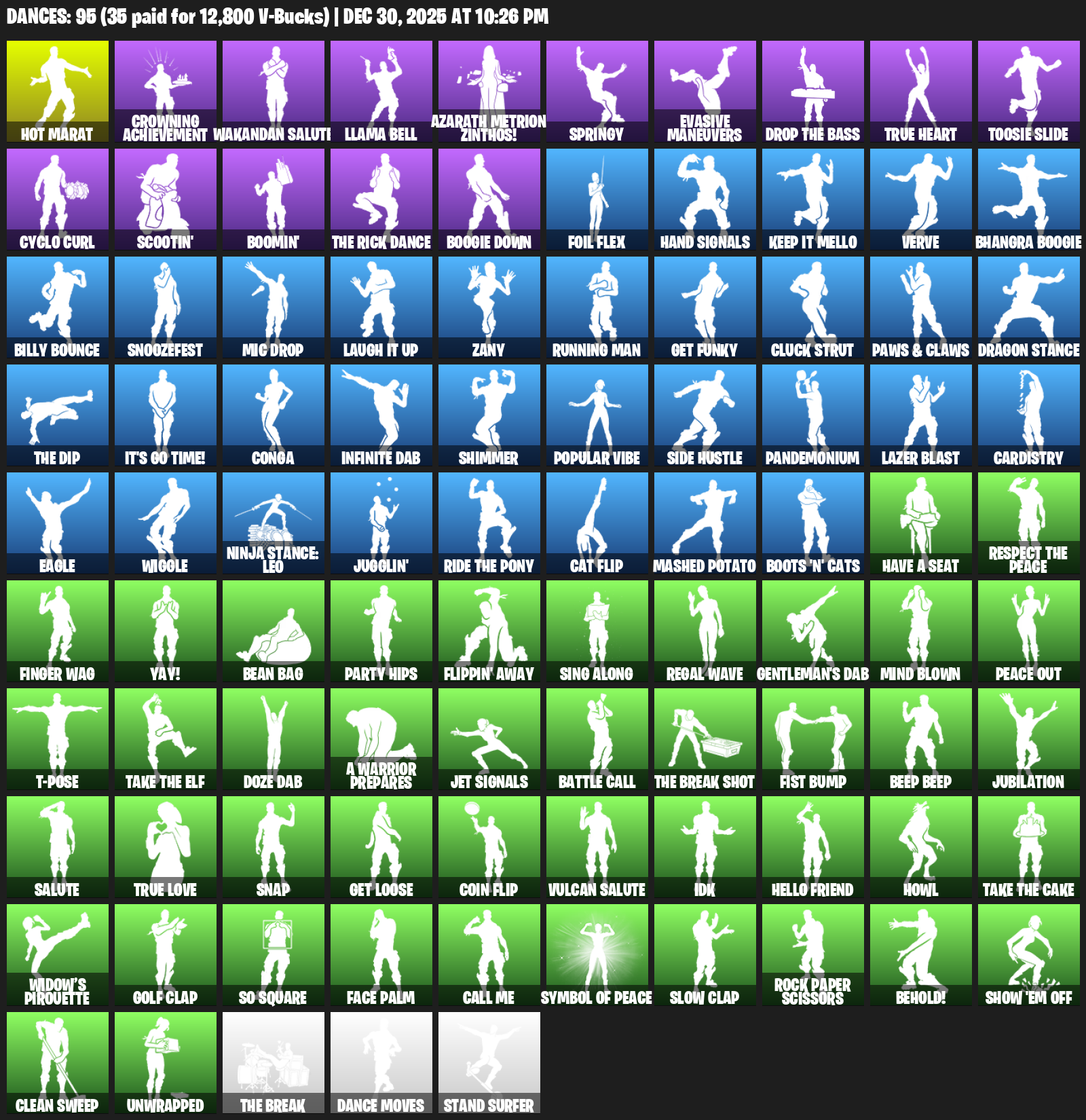 Hot Marat, Crowning Achievement, Wakandan Salute, Llama Bell, Azarath Metrion Zinthos!, Springy, Evasive Maneuvers, True Heart, Toosie Slide, Cyclo Curl, Scootin’, Boomin’, Boogie Down, Foil Flex, Hand Signals, Keep It Mello, Verve