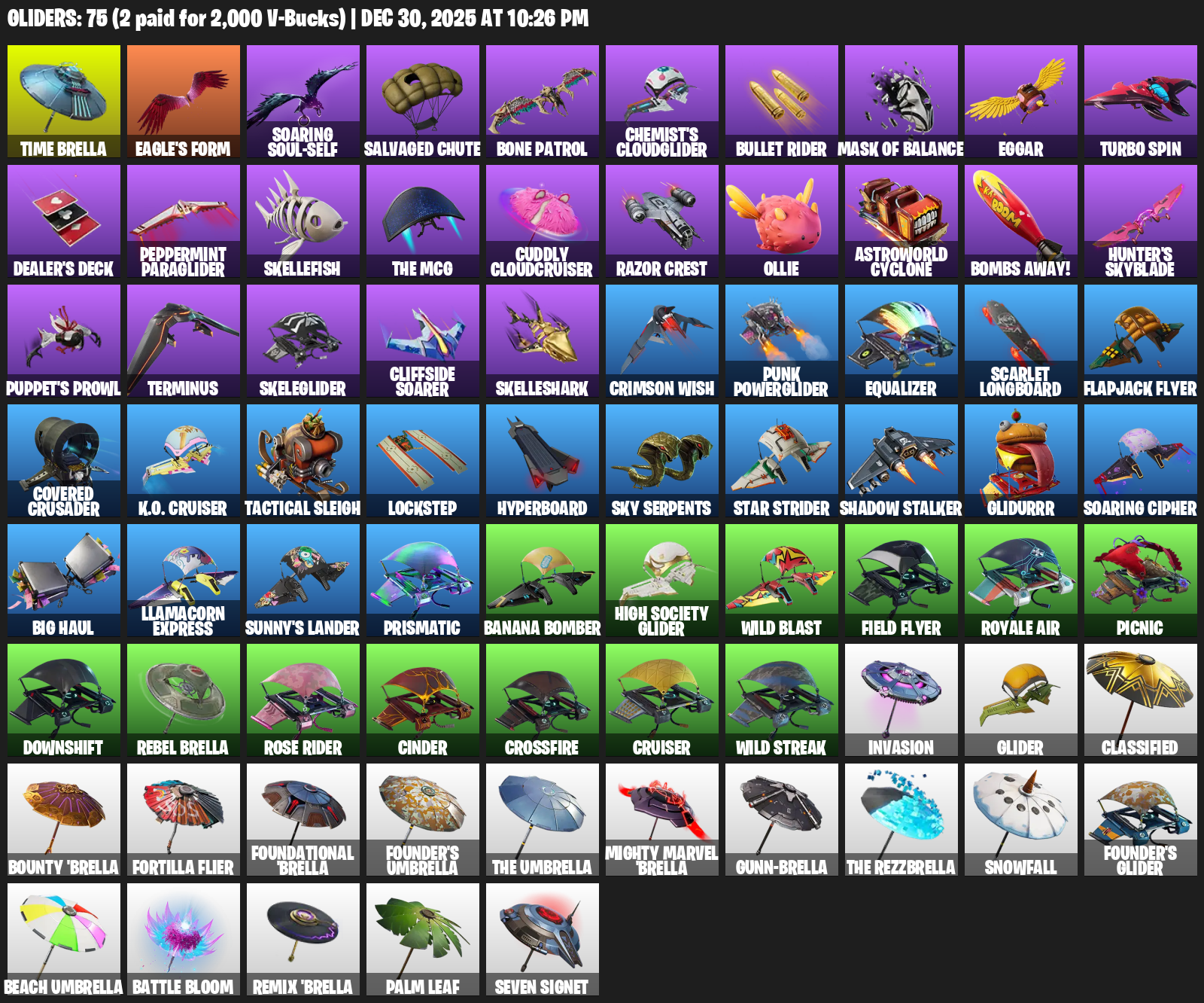 Time Brella, Soaring Soul-Self, Salvaged Chute, Bone Patrol, Chemist’s Cloudglider, Bullet Rider, Eggar, Turbo Spin, Dealer’s Deck, Peppermint Paraglider, Skellefish, Cuddly Cloudcruiser, Razor Crest, Ollie, Astroworld Cyclone, Bombs Away!, Hunter’s Skyblade