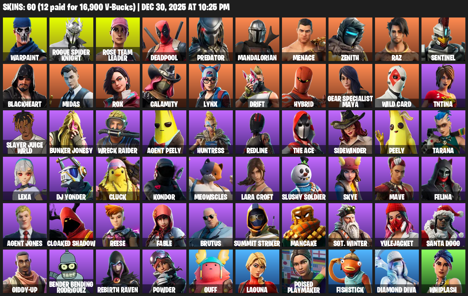 Gear Specialist Maya, Lara Croft, Warpaint, Rogue Spider Knight, Rose Team Leader, Deadpool, Predator, Mandalorian, Menace, Zenith, Raz, Sentinel, Blackheart, Midas, Rox, Calamity, Lynx, Drift, Hybrid, Wild Card
