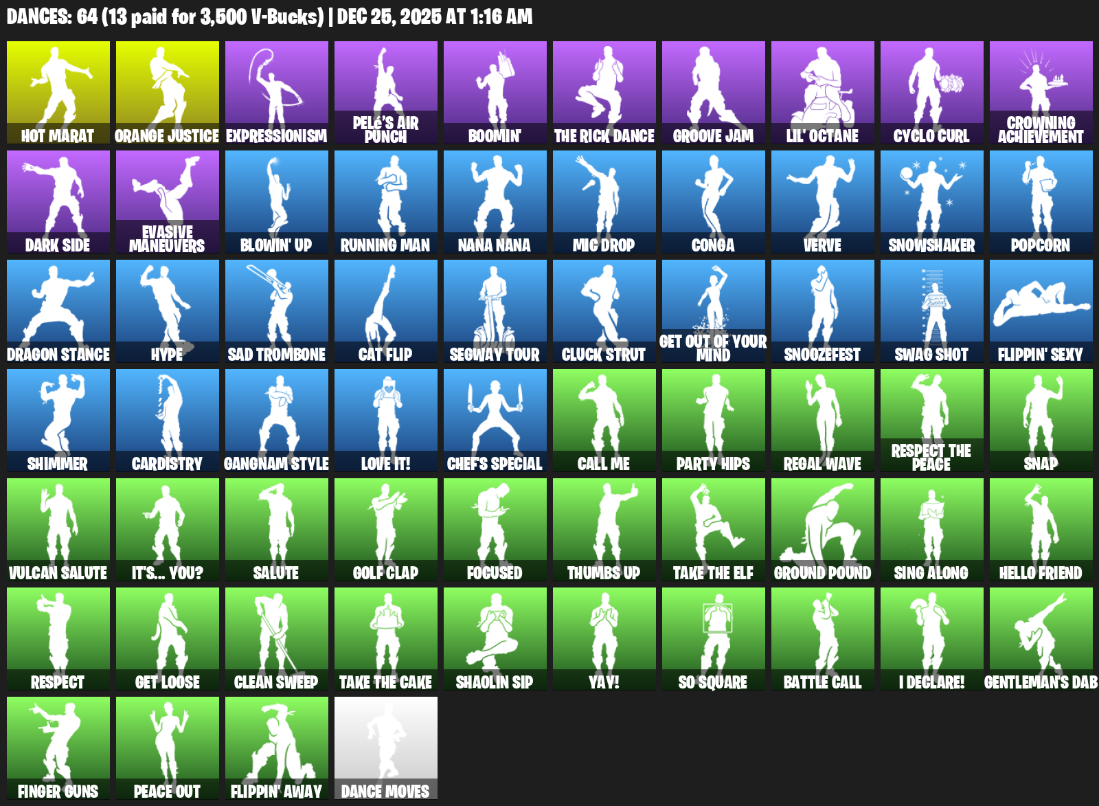Hot Marat, Orange Justice, Expressionism, Pelé’s Air Punch, Boomin’, Groove Jam, Lil’ Octane, Cyclo Curl, Crowning Achievement, Dark Side, Evasive Maneuvers, Blowin’ Up, Running Man, Nana Nana, Mic Drop, Conga, Verve, Snowshaker, Popcorn