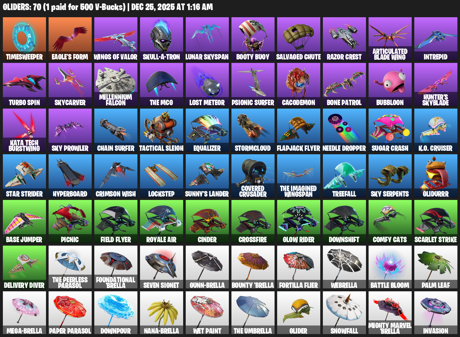 Timesweeper, Eagle’s Form, Skull-a-tron, Lunar Skyspan, Booty Buoy, Salvaged Chute, Razor Crest, Articulated Blade Wing, Intrepid, Turbo Spin, Skycarver, Millennium Falcon, Lost Meteor, Psionic Surfer, Cacodemon, Bone Patrol, Bubbloon, Hunter’s Skyblade