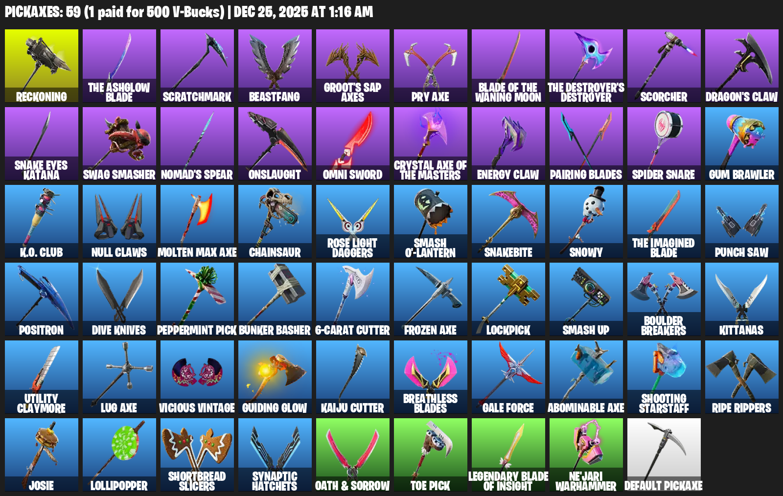 Reckoning, Scratchmark, Beastfang, Groot’s Sap Axes, Pry Axe, Scorcher, Dragon’s Claw, Snake Eyes Katana, Swag Smasher, Nomad’s Spear, Onslaught, Omni Sword, Pairing Blades, Spider Snare, Gum Brawler