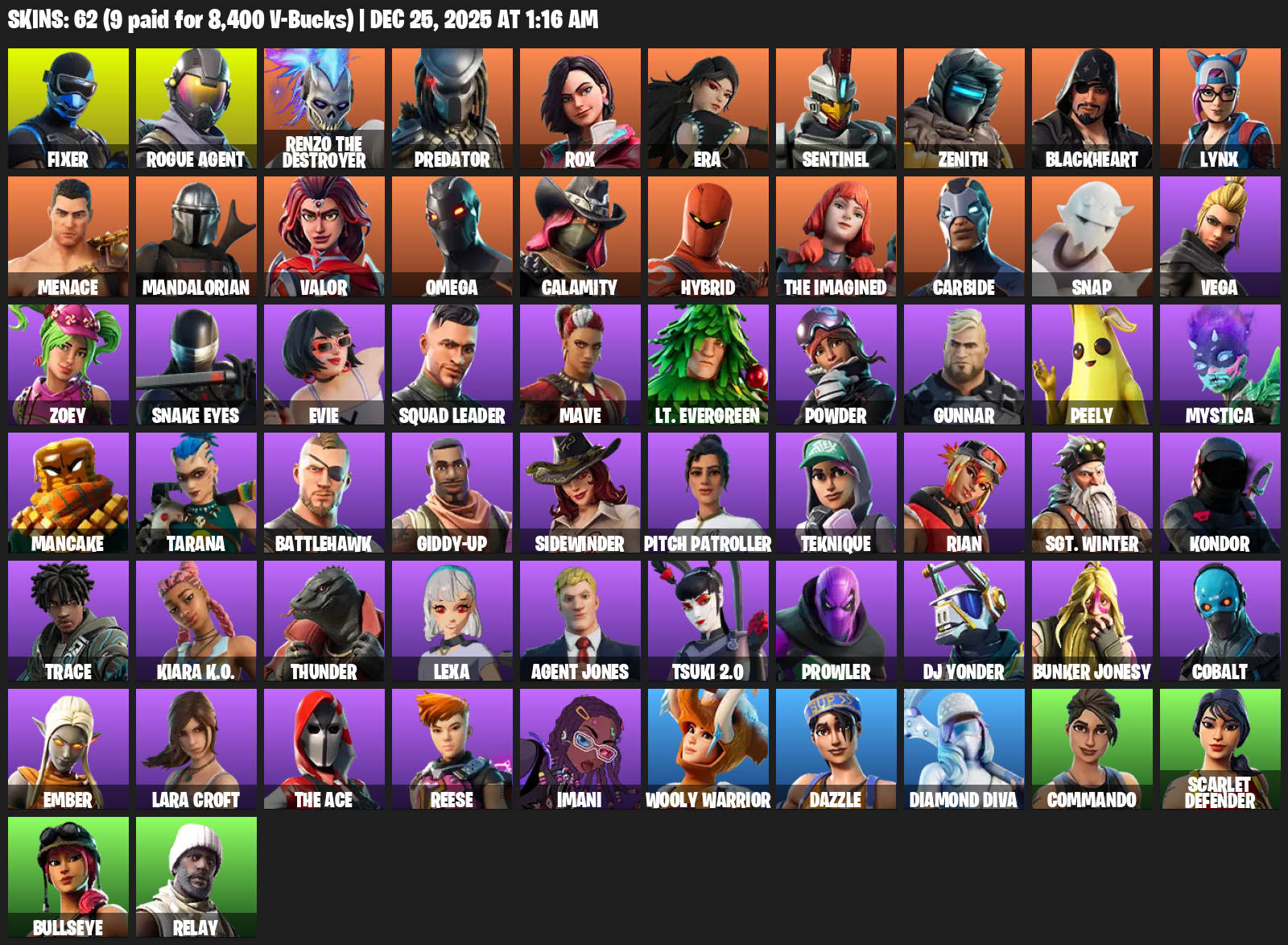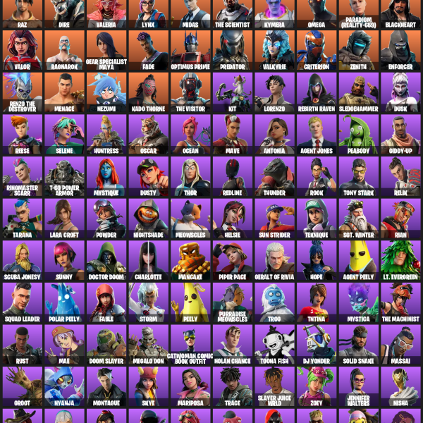 Omega, Lara Croft, Fixer, Rogue Agent, Renzo the Destroyer, Predator, Rox, Era, Sentinel, Zenith, Blackheart, Lynx, Menace, Mandalorian, Valor, Calamity, Hybrid, Carbide, Snap