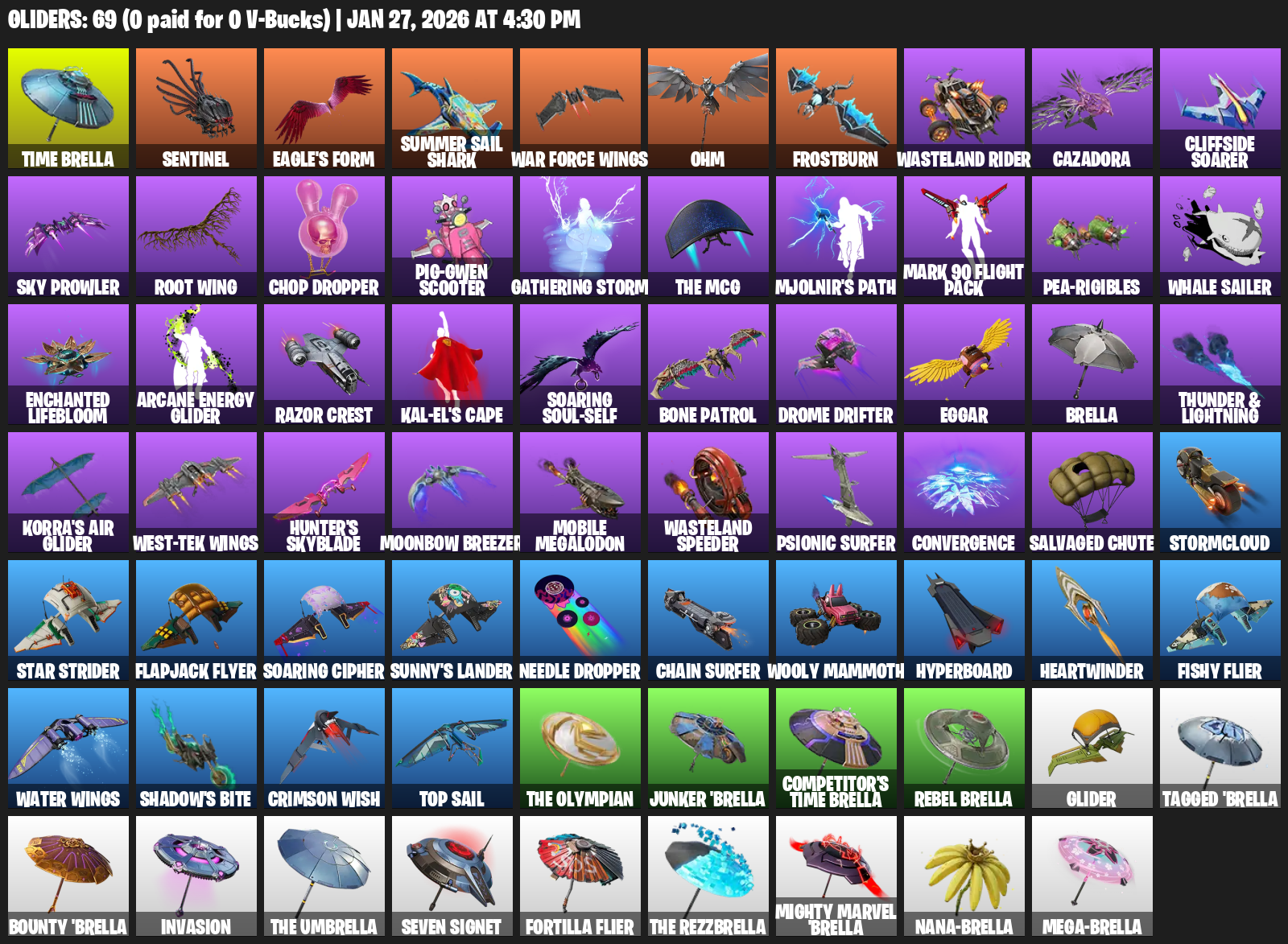 Time Brella, Sentinel, Summer Sail Shark, War Force Wings, Ohm, Frostburn, Wasteland Rider, Cazadora, Cliffside Soarer, Sky Prowler, Root Wing, Chop Dropper, Pig-Gwen Scooter, Mjolnir’s Path, Mark 90 Flight Pack, Pea-rigibles, Whale Sailer