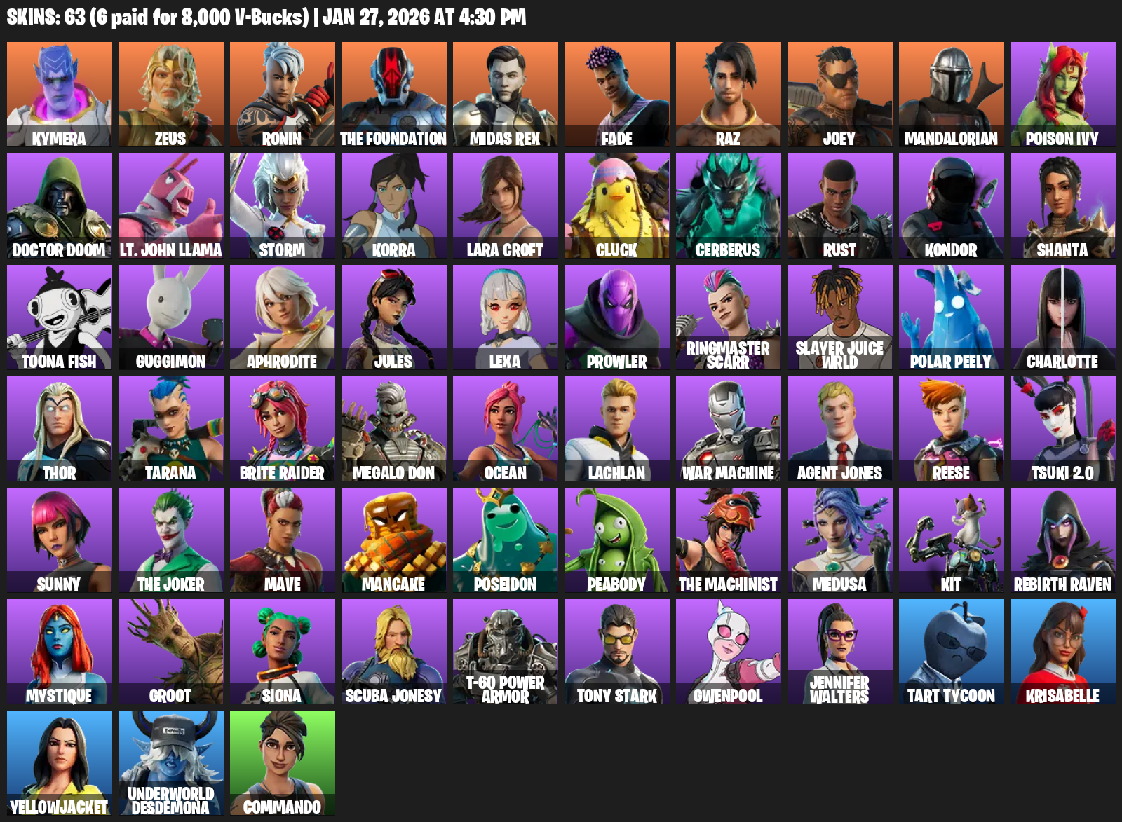 Lara Croft, Kymera, Zeus, Ronin, The Foundation, Midas Rex, Fade, Raz, Joey, Mandalorian, Poison Ivy, Doctor Doom, Lt. John Llama, Storm, Korra, Cluck, Cerberus, Rust, Kondor, Shanta