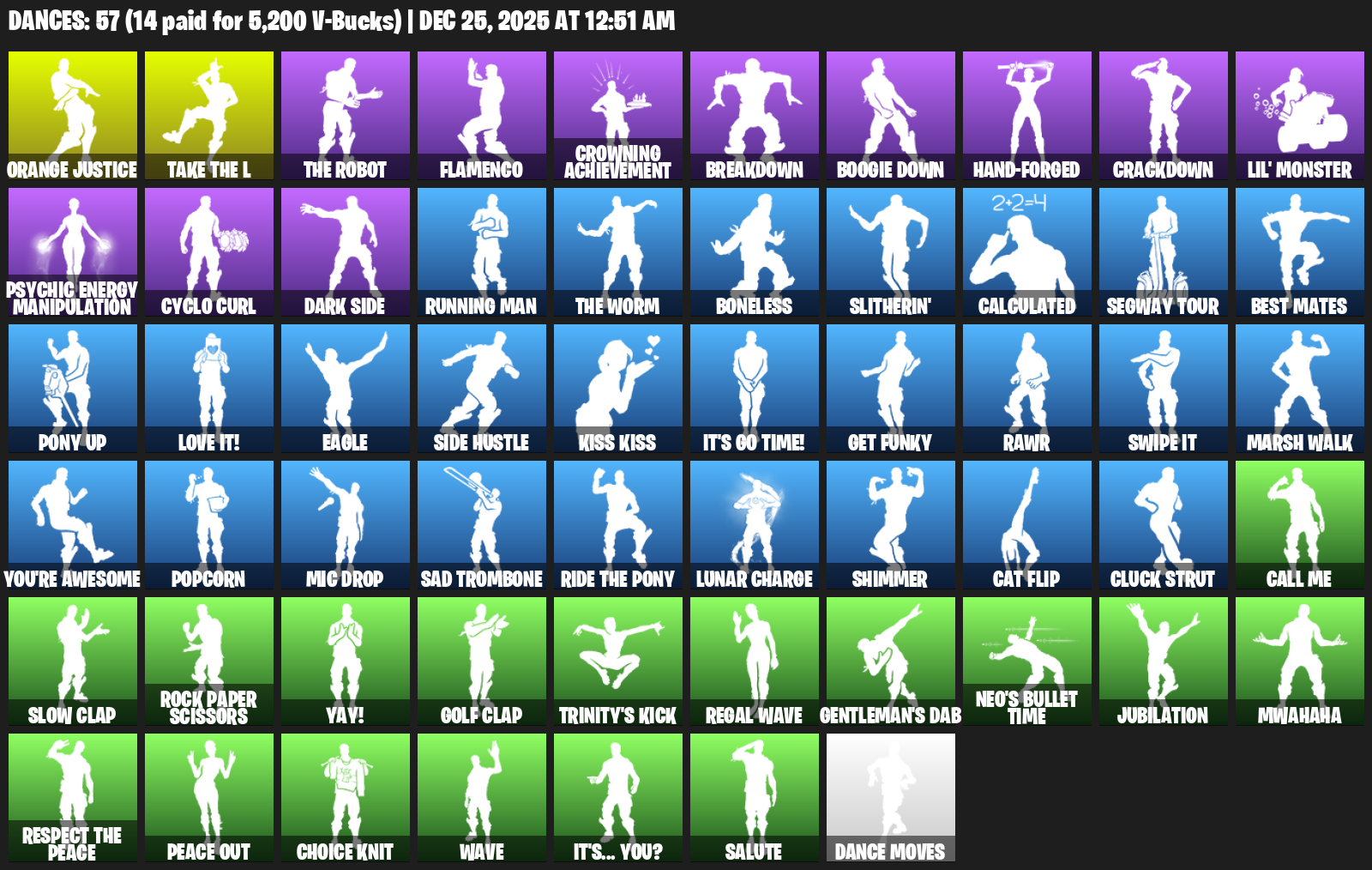 Orange Justice, Flamenco, Crowning Achievement, Breakdown, Boogie Down, Crackdown, Lil’ Monster, Cyclo Curl, Running Man, Boneless, Slitherin’, Calculated, Segway Tour, Best Mates