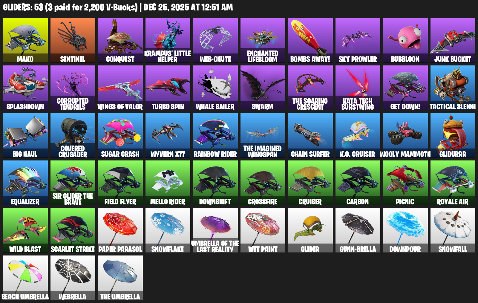 Mako, Conquest, Krampus’ Little Helper, Enchanted Lifebloom, Bombs Away!, Sky Prowler, Bubbloon, Junk Bucket, Splashdown, Corrupted Tendrils, Wings of Valor, Turbo Spin, Whale Sailer, Swarm, Kata Tech Burstwing, Get Down!, Tactical Sleigh