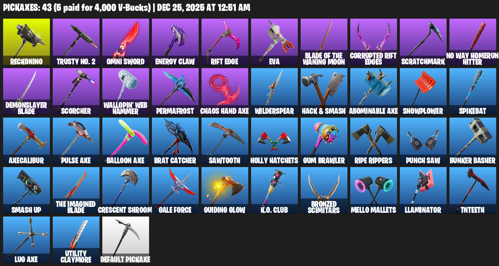 Reckoning, Trusty No. 2, Omni Sword, Energy Claw, Rift Edge, EVA, Scratchmark, No Way Homerun Hitter, Demonslayer Blade, Scorcher, Wallopin’ Web Hammer, Permafrost, Chaos Hand Axe, Wilderspear, Hack & Smash, Snowplower, Spikebat