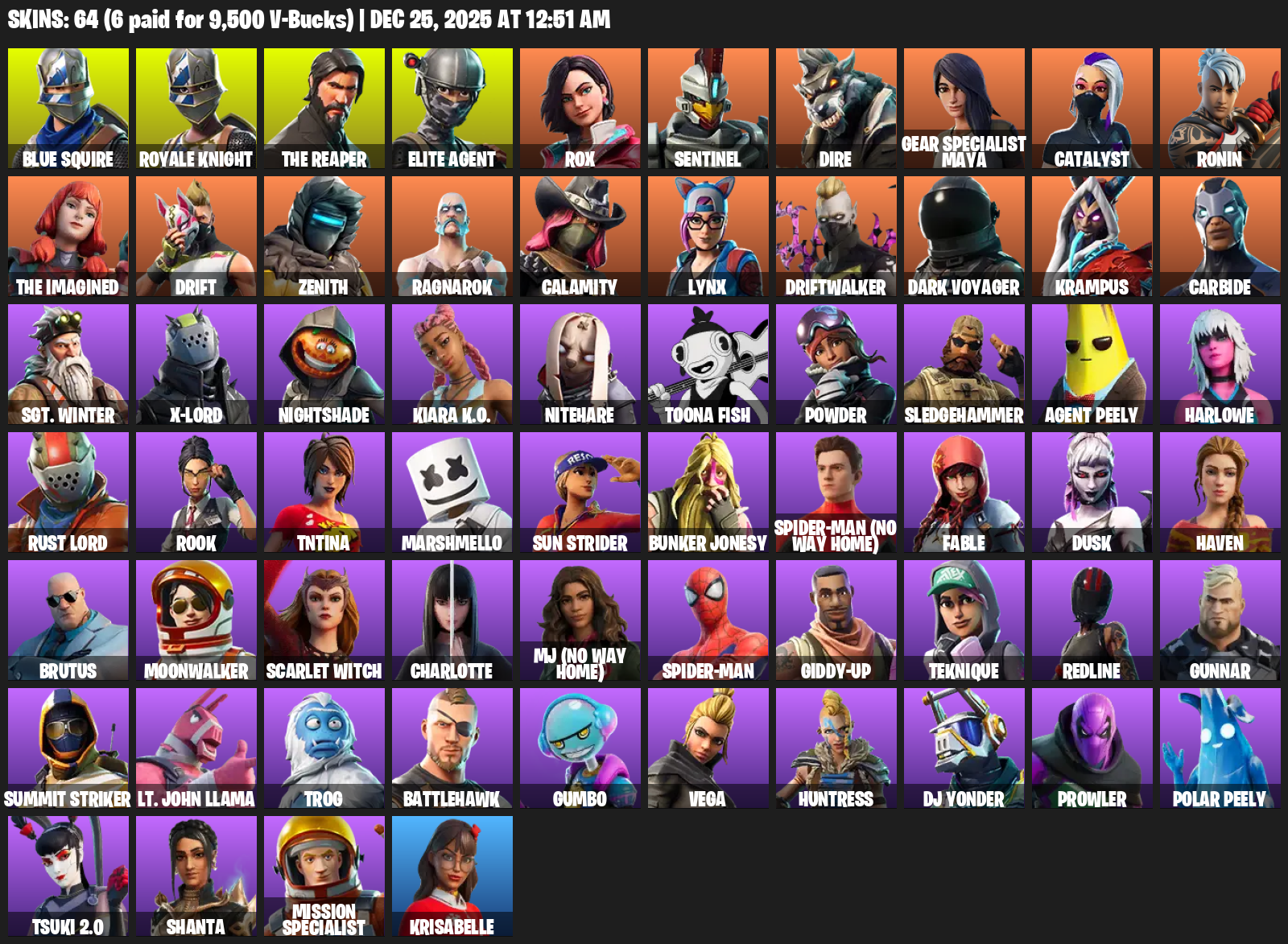 Blue Squire, Royale Knight, The Reaper, Elite Agent, Gear Specialist Maya, Rox, Sentinel, Dire, Catalyst, Ronin, Drift, Zenith, Ragnarok, Calamity, Lynx, Driftwalker, Dark Voyager, Krampus, Carbide