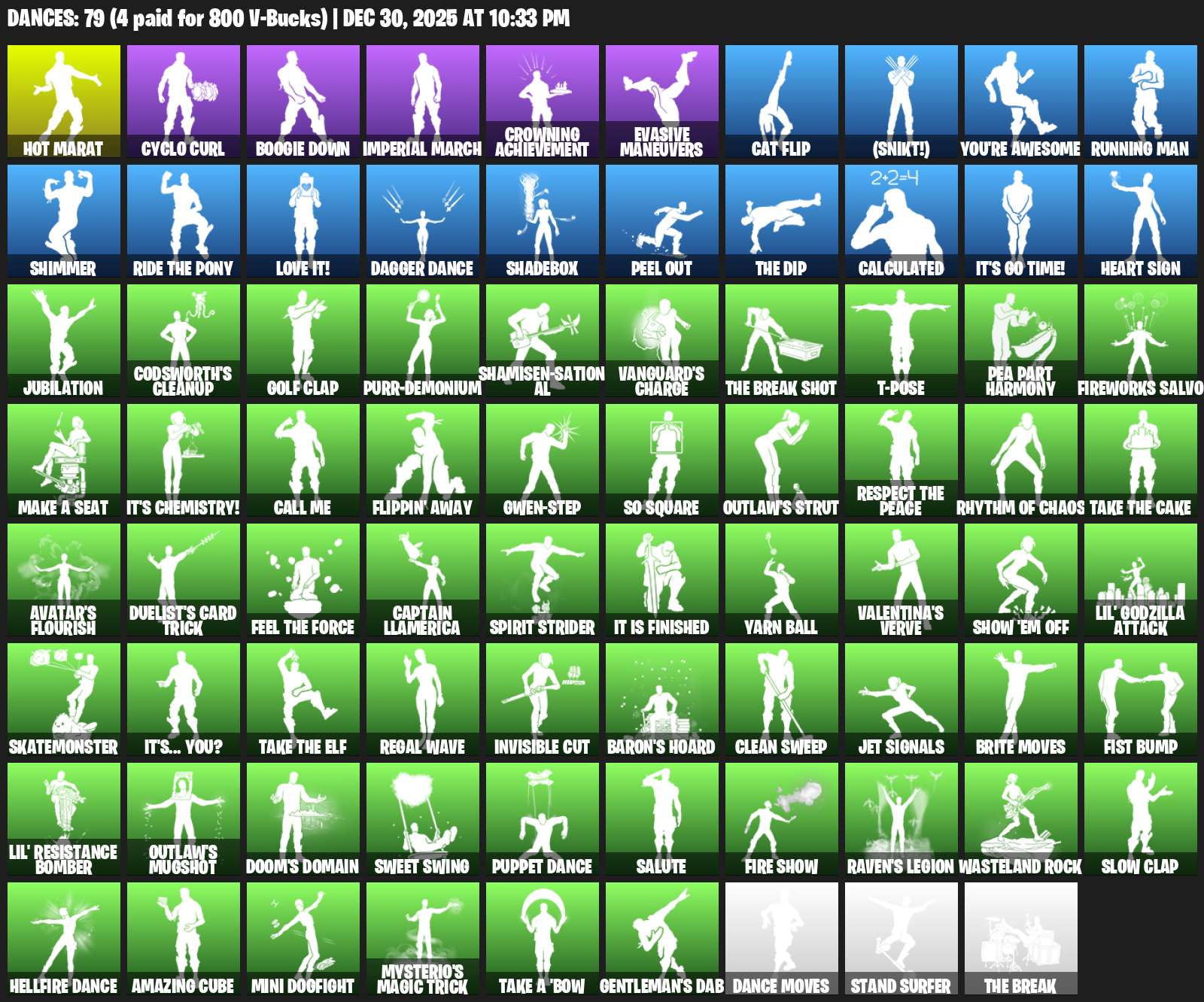 Hot Marat, Cyclo Curl, Boogie Down, Imperial March, Crowning Achievement, Evasive Maneuvers, Cat Flip, (Snikt!), You’re Awesome, Running Man, Shimmer, Love it!, Dagger Dance, Shadebox, Peel Out, Calculated, It’s Go Time!, Heart Sign