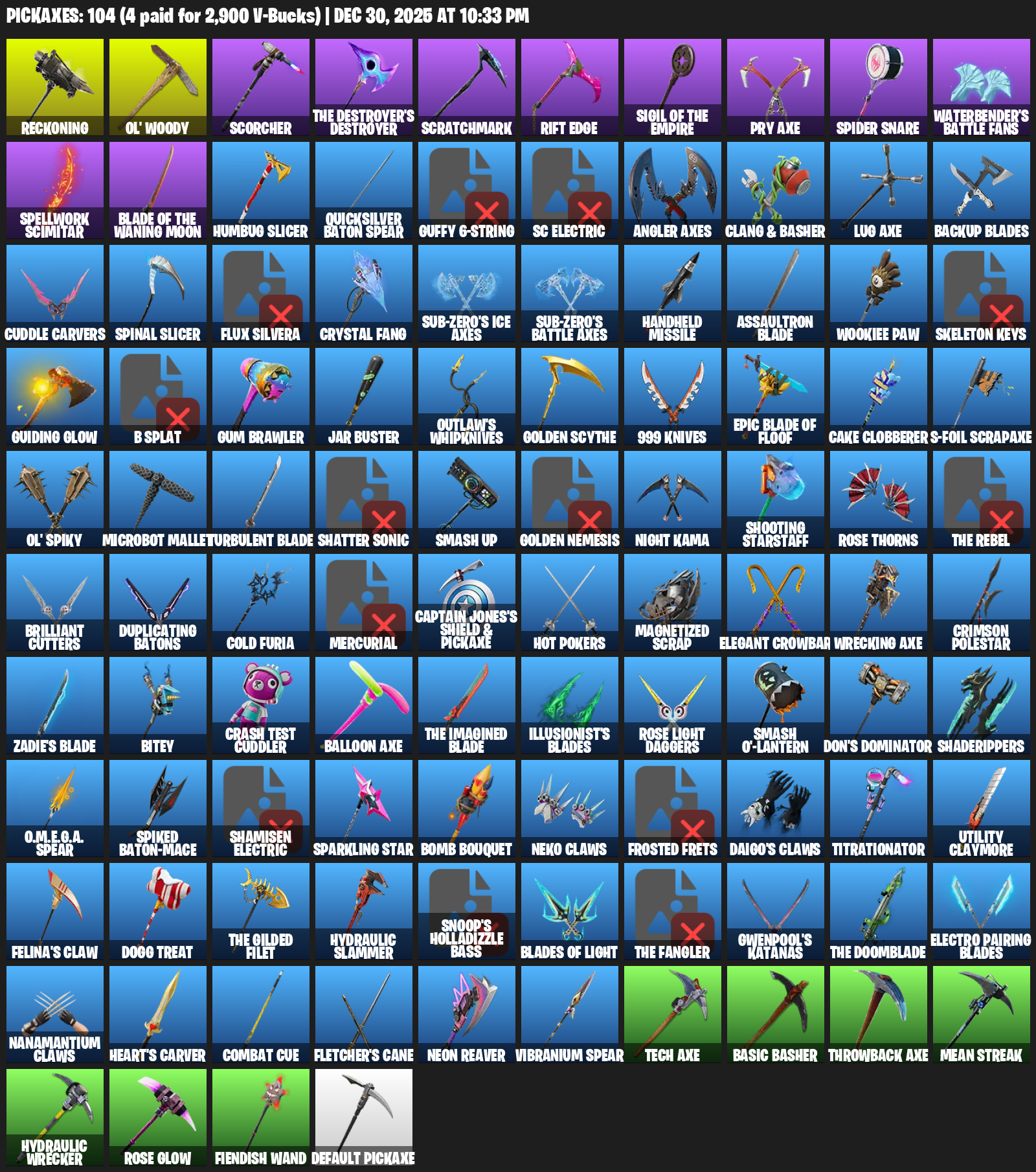 Reckoning, Ol’ Woody, Scorcher, The Destroyer’s Destroyer, Scratchmark, Rift Edge, Pry Axe, Spider Snare, Waterbender’s Battle Fans, Spellwork Scimitar, Humbug Slicer, Quicksilver Baton Spear, Guffy 6-String, SC Electric, Angler Axes, Clang & Basher, Backup Blades