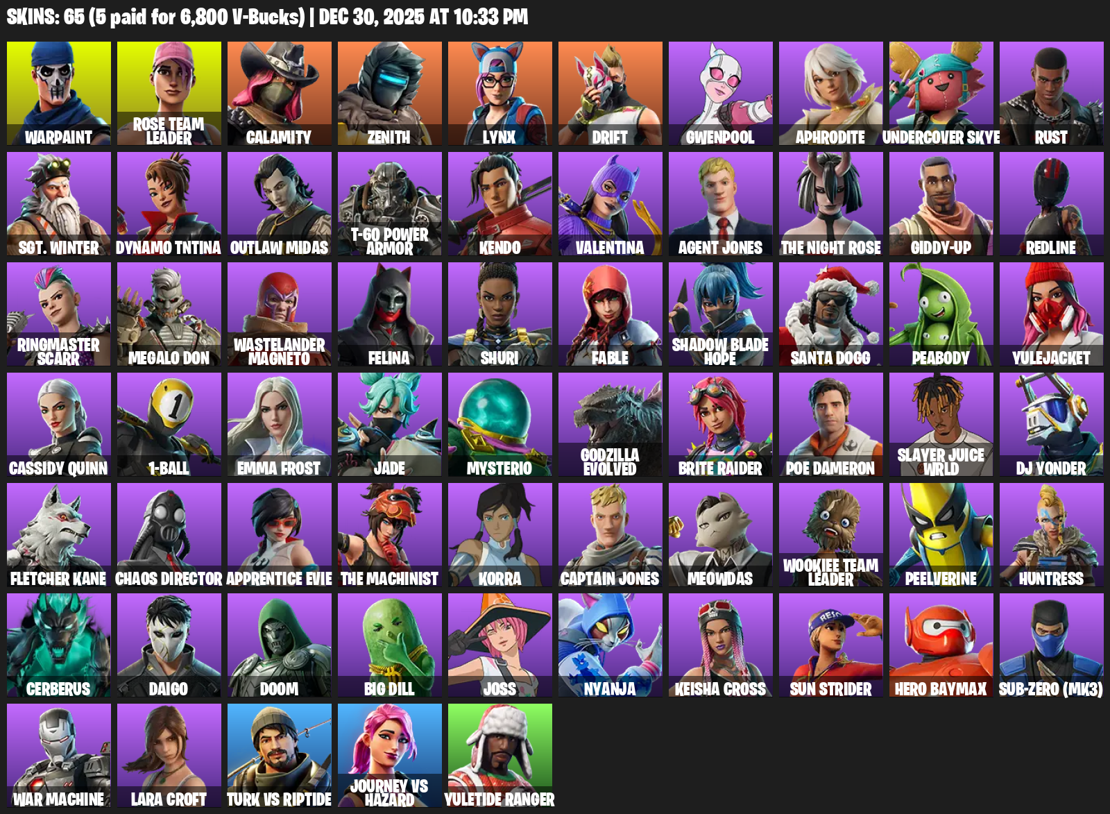 Lara Croft, Warpaint, Rose Team Leader, Calamity, Zenith, Lynx, Drift, Gwenpool, Aphrodite, Undercover Skye, Rust, Sgt. Winter, Dynamo TNTina, Outlaw Midas, T-60 Power Armor, Kendo, Valentina, Agent Jones, Giddy-up
