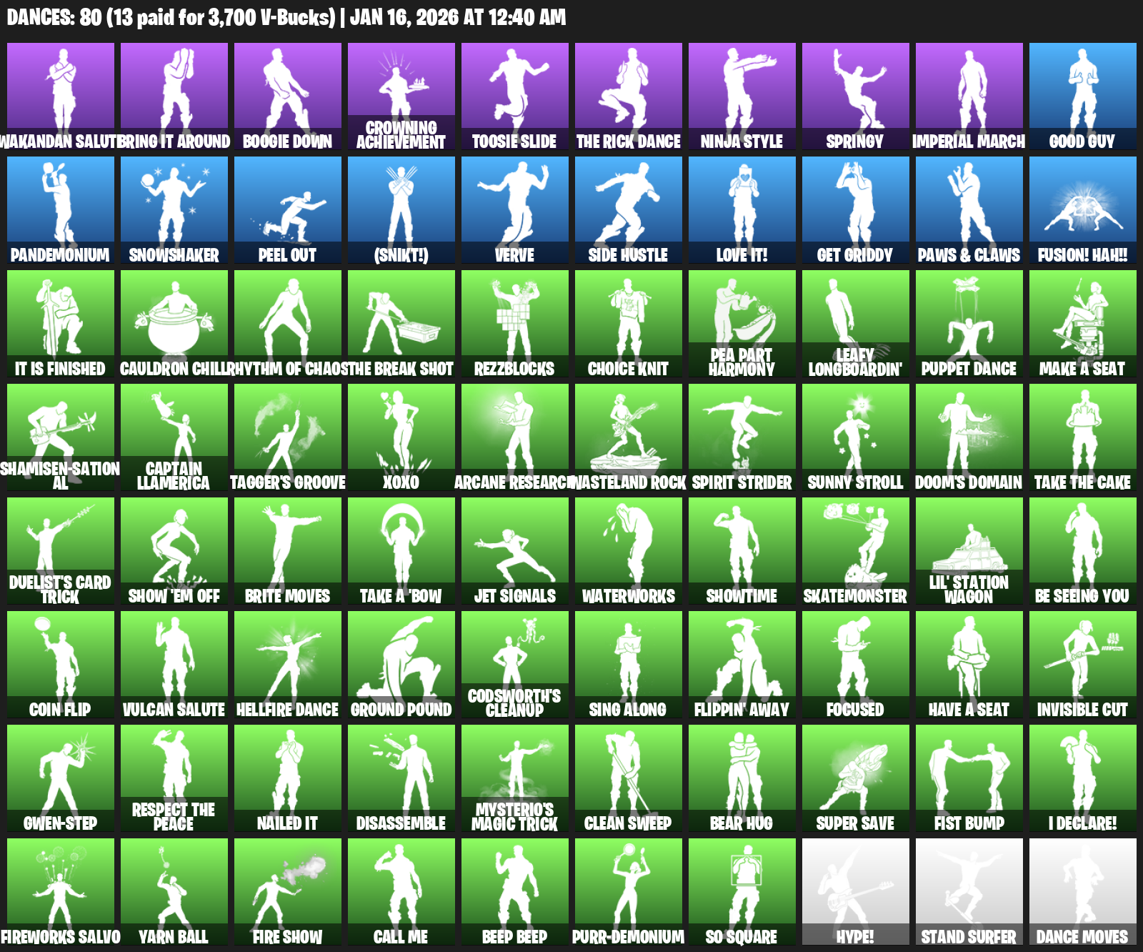 Wakandan Salute, Bring it around, Boogie Down, Crowning Achievement, Toosie Slide, Ninja Style, Springy, Imperial March, Good Guy, Pandemonium, Snowshaker, Peel Out, (Snikt!), Verve, Side Hustle, Love it!, Get Griddy, Fusion! Hah!!
