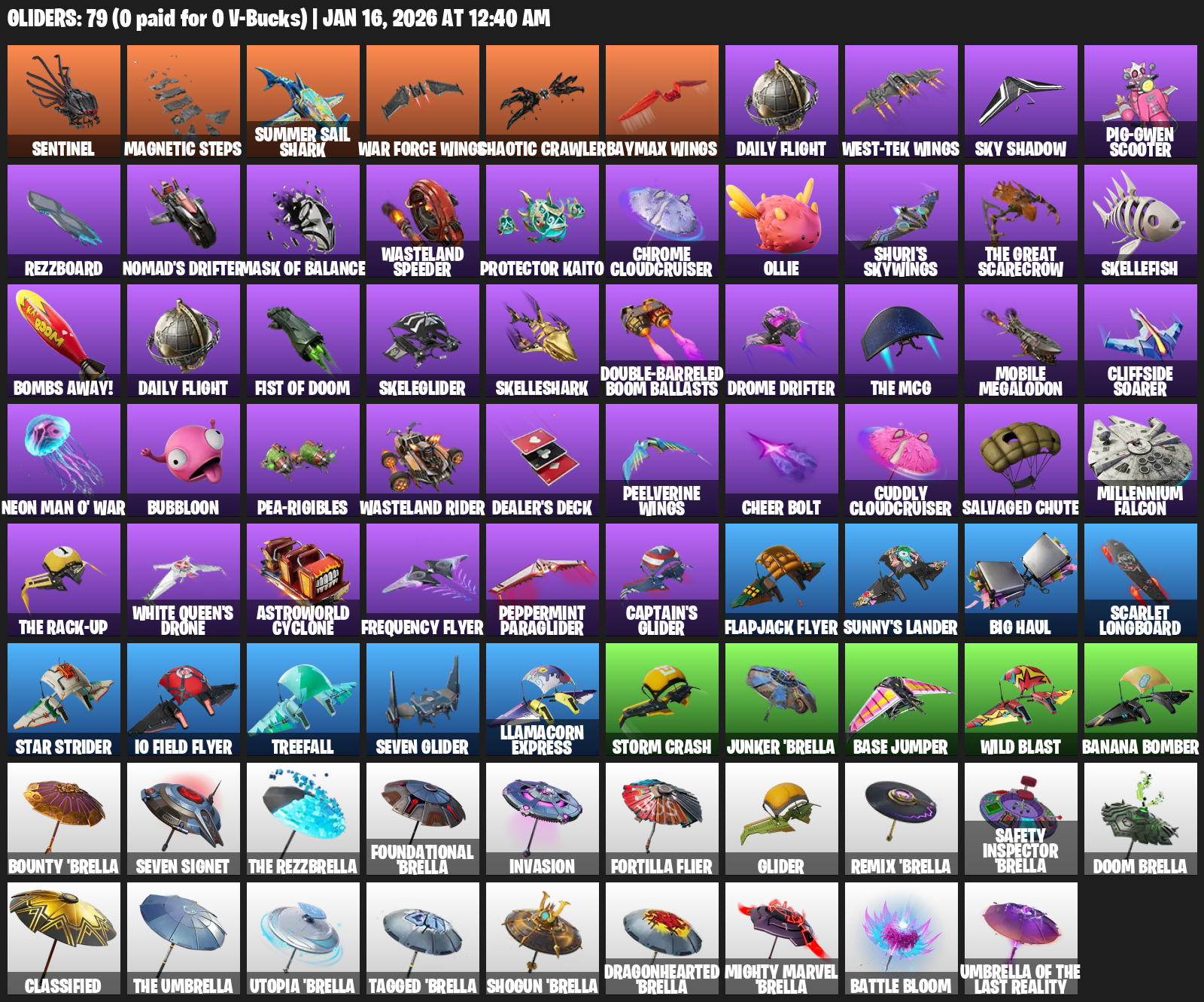 Sentinel, Magnetic Steps, Summer Sail Shark, Chaotic Crawler, Baymax Wings, Daily Flight, Pig-Gwen Scooter, Rezzboard, Nomad’s Drifter, Wasteland Speeder, Protector Kaito, Chrome Cloudcruiser, Ollie, Shuri’s Skywings, Skellefish