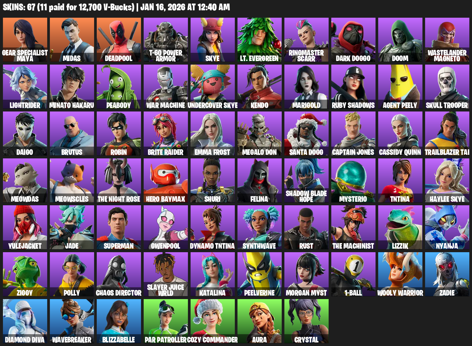 Gear Specialist Maya, Midas, Deadpool, T-60 Power Armor, Skye, Lt. Evergreen, Ringmaster Scarr, Dark Doggo, Doom, Wastelander Magneto, Lightrider, Minato Hakaru, Peabody, War Machine, Kendo, Marigold, Ruby Shadows, Agent Peely, Skull Trooper