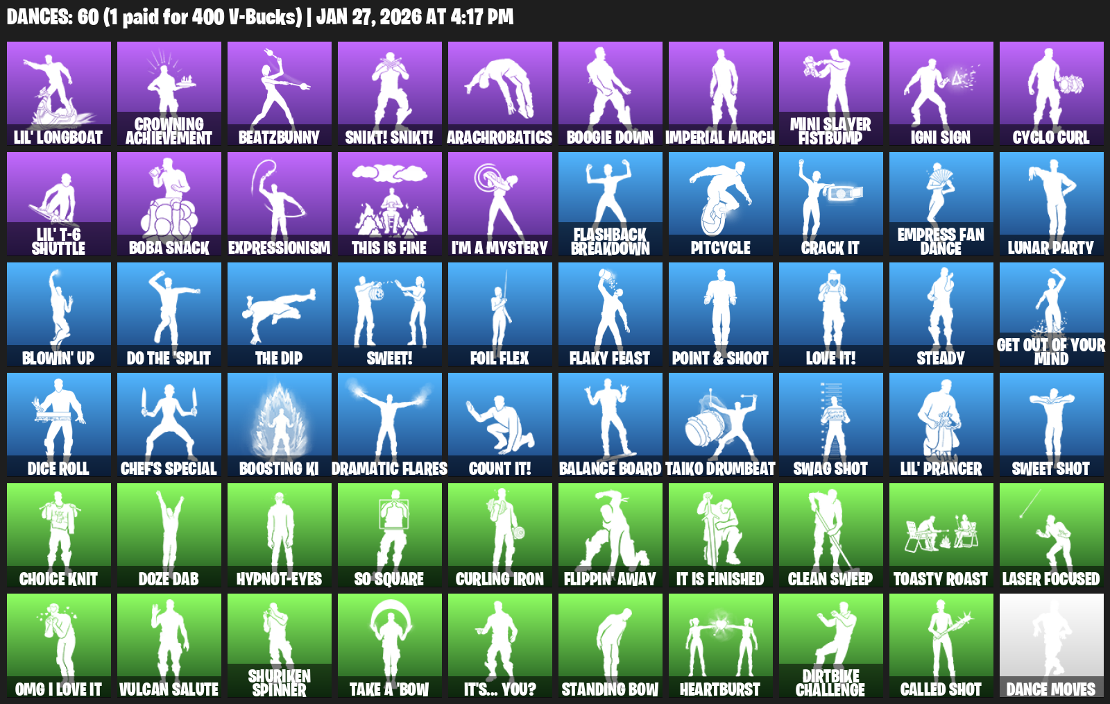 Lil’ Longboat, Crowning Achievement, BeatzBunny, Snikt! Snikt!, Arachrobatics, Boogie Down, Imperial March, Mini Slayer Fistbump, Igni Sign, Cyclo Curl, Boba Snack, Expressionism, This is Fine, I’m a Mystery, Flashback Breakdown, Pitcycle, Crack It, Empress Fan Dance, Lunar Party
