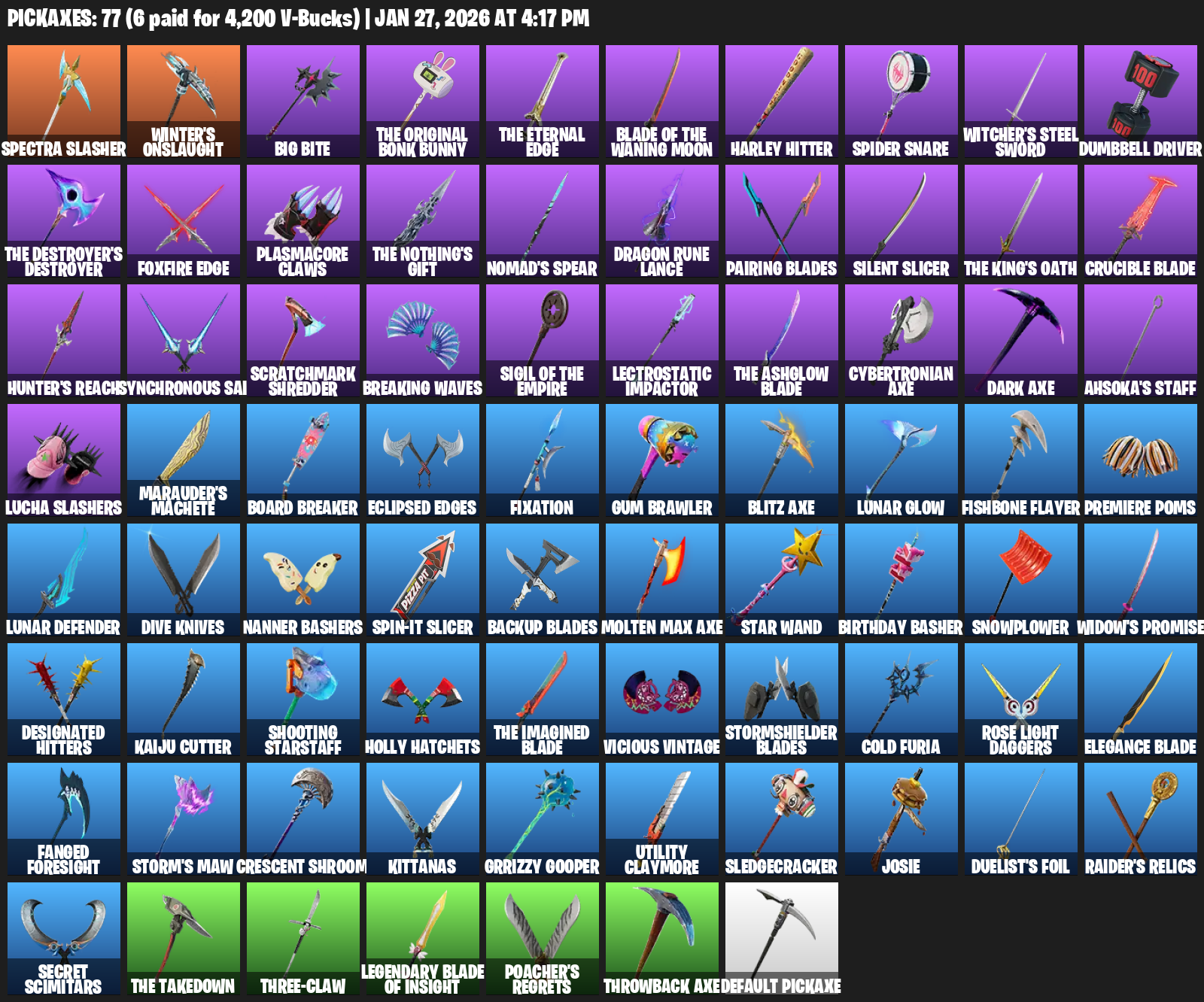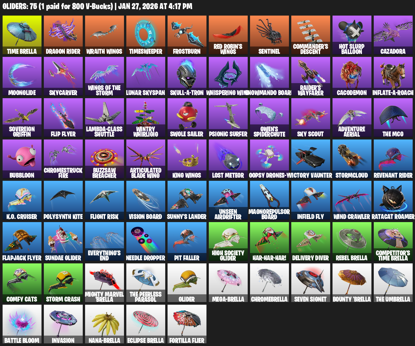Time Brella, Wraith Wings, Timesweeper, Frostburn, Sentinel, Commander’s Descent, Hot Slurp Balloon, Cazadora, Moonglide, Skycarver, Whispering Wind, Snowmando Board, Raider’s Wayfarer, Cacodemon