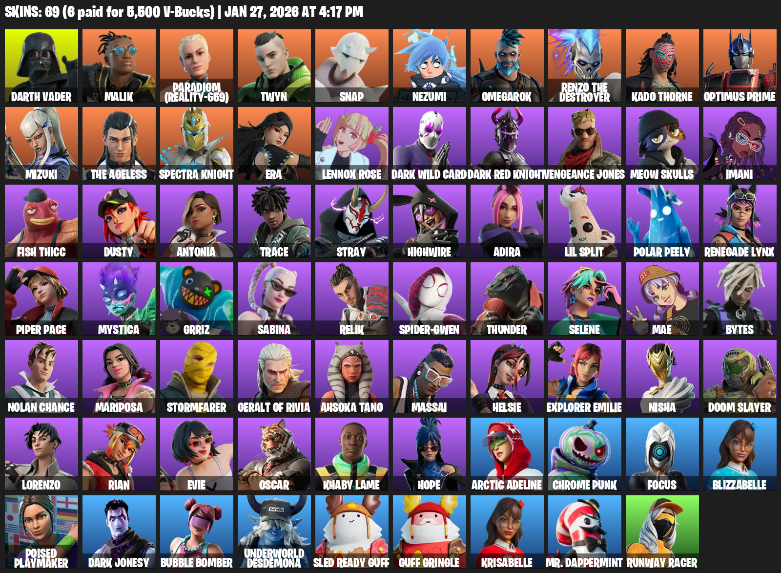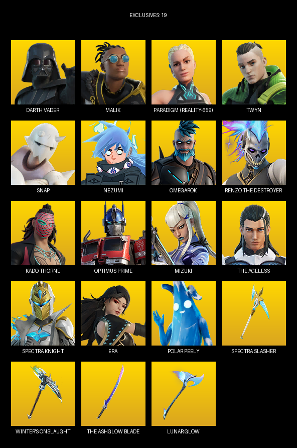 Darth Vader, Malik, Paradigm (Reality-659), Twyn, Snap, Nezumi, Omegarok, Renzo the Destroyer, Kado Thorne, Optimus Prime, Mizuki, Spectra Knight, Era, Lennox Rose, Dark Wild Card, Vengeance Jones, Meow Skulls, Imani