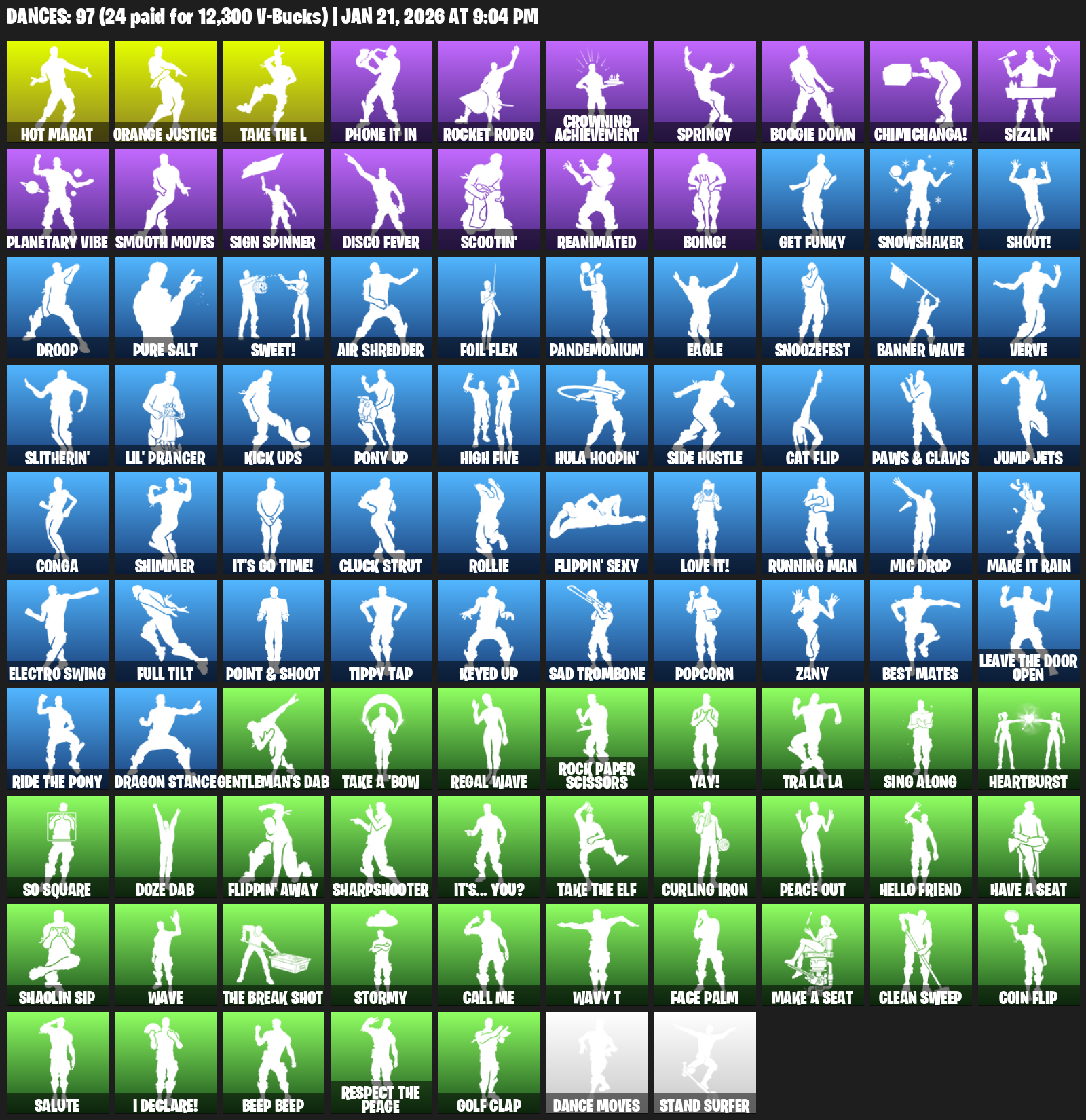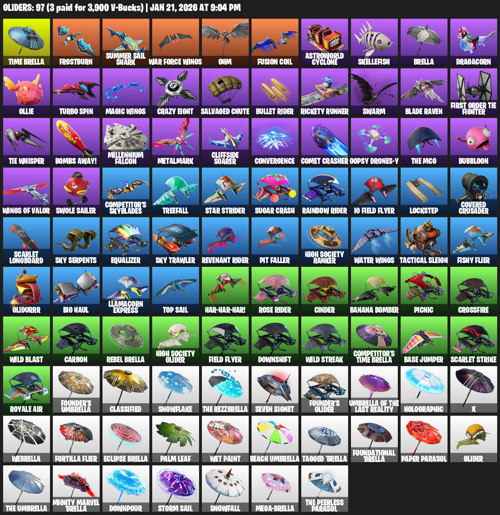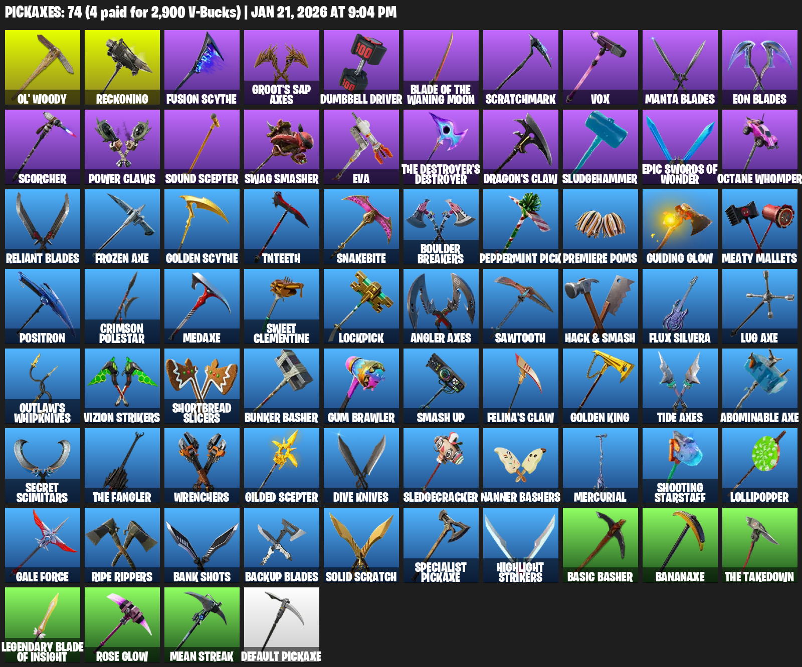 Ol’ Woody, Reckoning, Groot’s Sap Axes, Dumbbell Driver, Blade of the Waning Moon, Scratchmark, Vox, Manta Blades, Scorcher, Power Claws, Sound Scepter, Swag Smasher, EVA, Dragon’s Claw, Sludgehammer, Octane Whomper