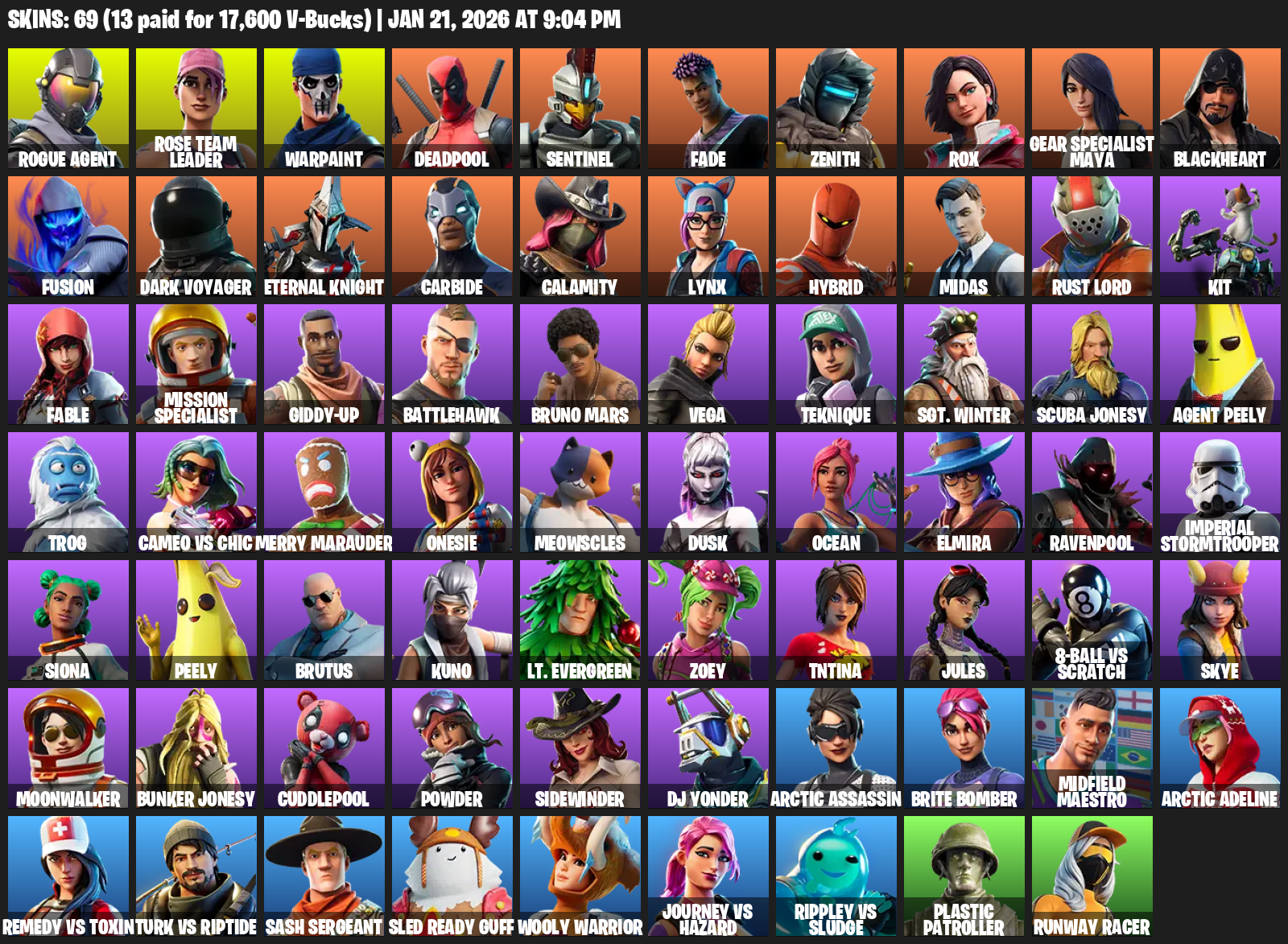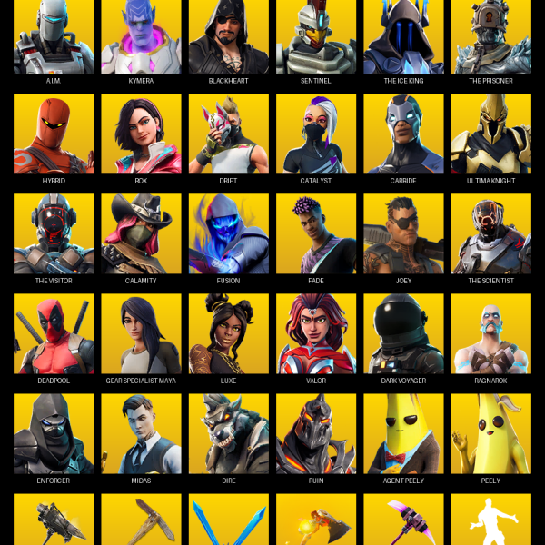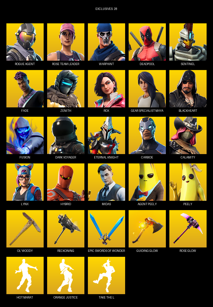 Gear Specialist Maya, Rogue Agent, Rose Team Leader, Warpaint, Deadpool, Sentinel, Fade, Zenith, Rox, Blackheart, Fusion, Dark Voyager, Eternal Knight, Carbide, Calamity, Lynx, Hybrid, Midas, Rust Lord, Kit
