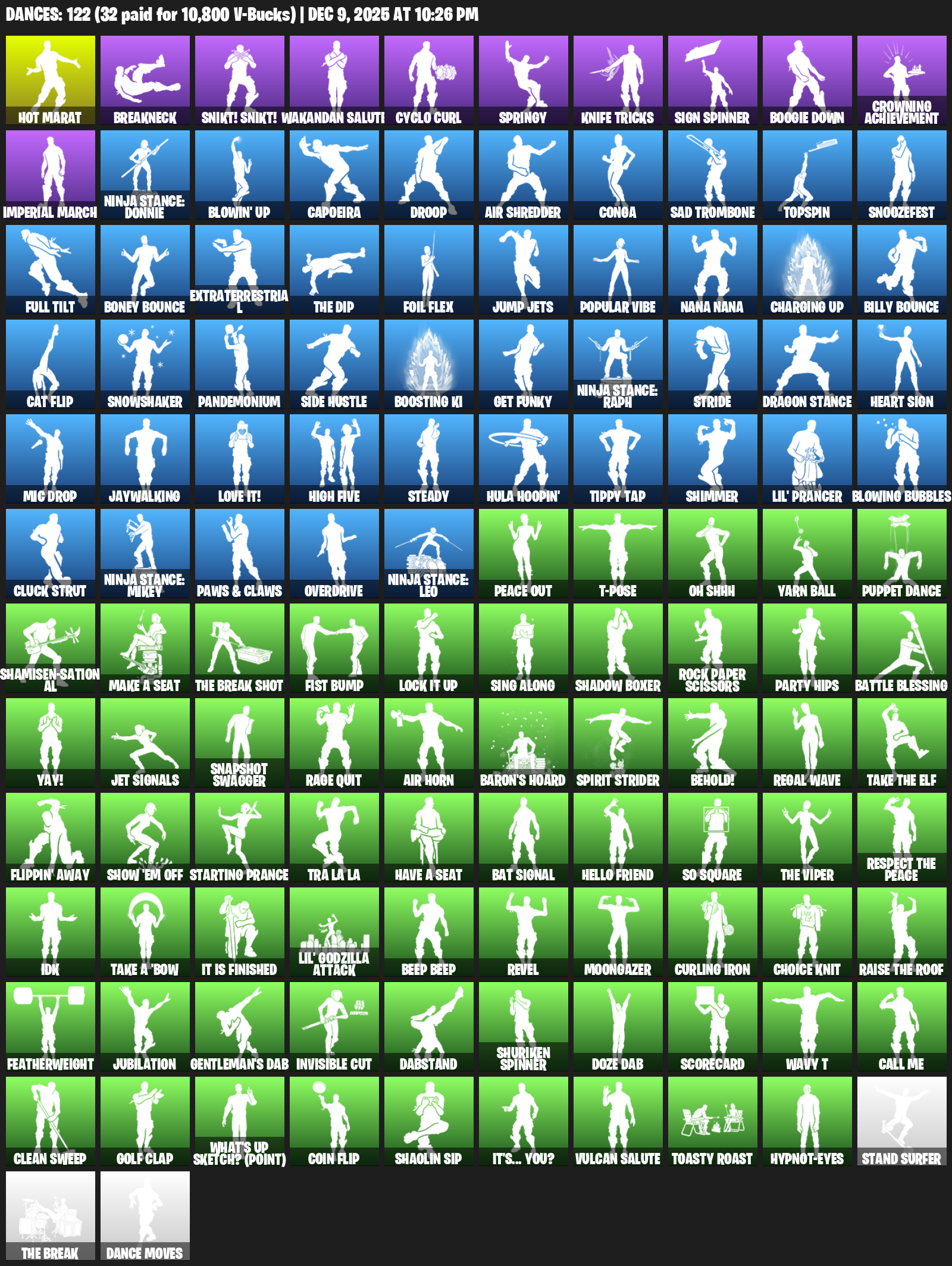Hot Marat, Breakneck, Snikt! Snikt!, Wakandan Salute, Cyclo Curl, Springy, Knife Tricks, Sign Spinner, Boogie Down, Crowning Achievement, Imperial March, Ninja Stance: Donnie, Blowin’ Up, Capoeira, Droop, Air Shredder, Conga, Sad Trombone, Topspin, Snoozefest