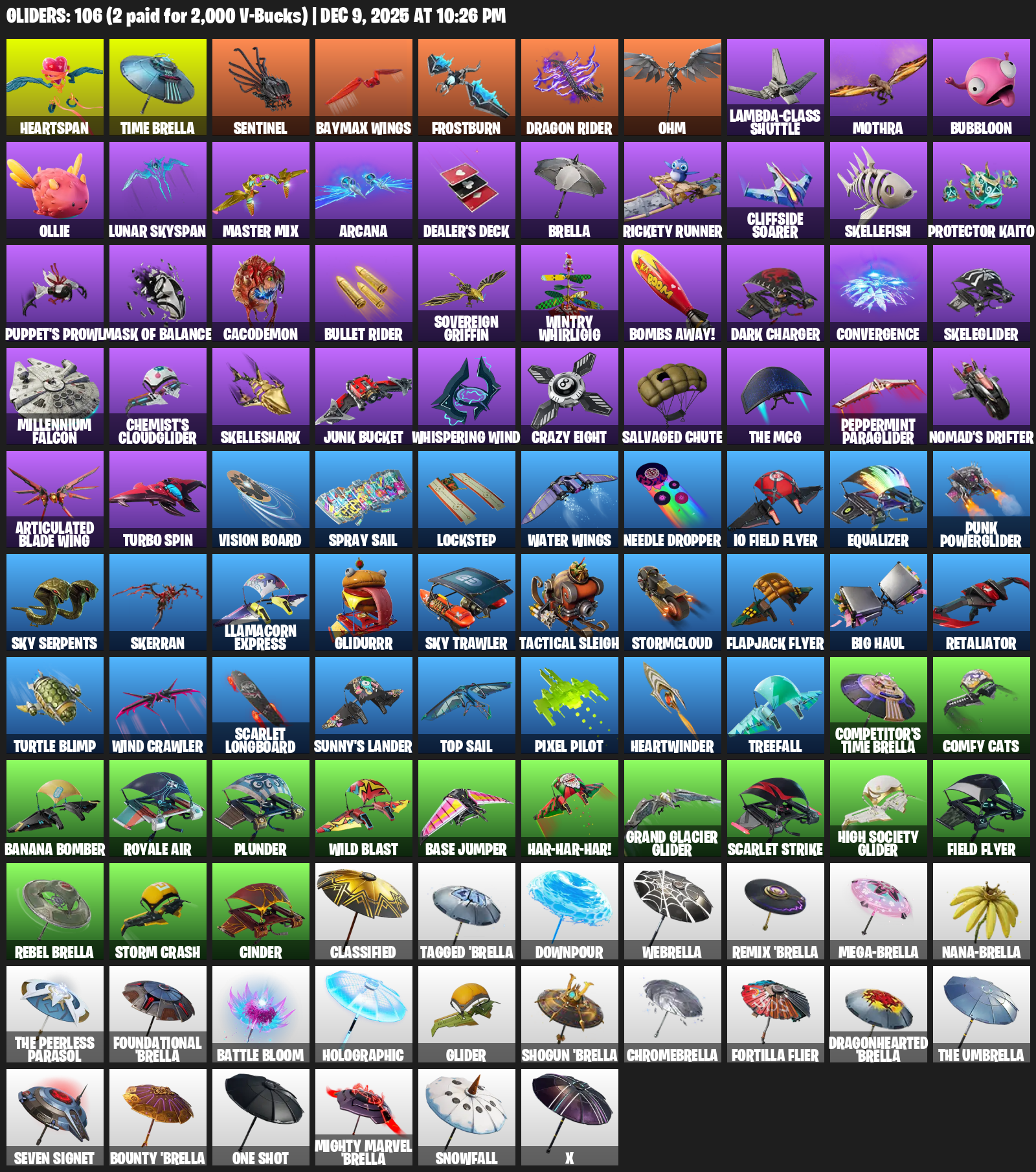 Heartspan, Time Brella, Baymax Wings, Frostburn, Ohm, Lambda-Class Shuttle, Mothra, Bubbloon, Ollie, Lunar Skyspan, Master Mix, Arcana, Dealer’s Deck, Rickety Runner, Cliffside Soarer, Skellefish, Protector Kaito