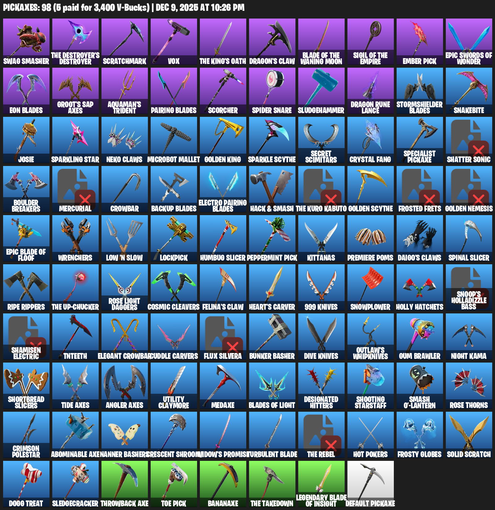 Swag Smasher, The Destroyer’s Destroyer, Scratchmark, Vox, Dragon’s Claw, Ember Pick, Eon Blades, Groot’s Sap Axes, Aquaman’s Trident, Scorcher, Spider Snare, Sludgehammer, Dragon Rune Lance, Snakebite