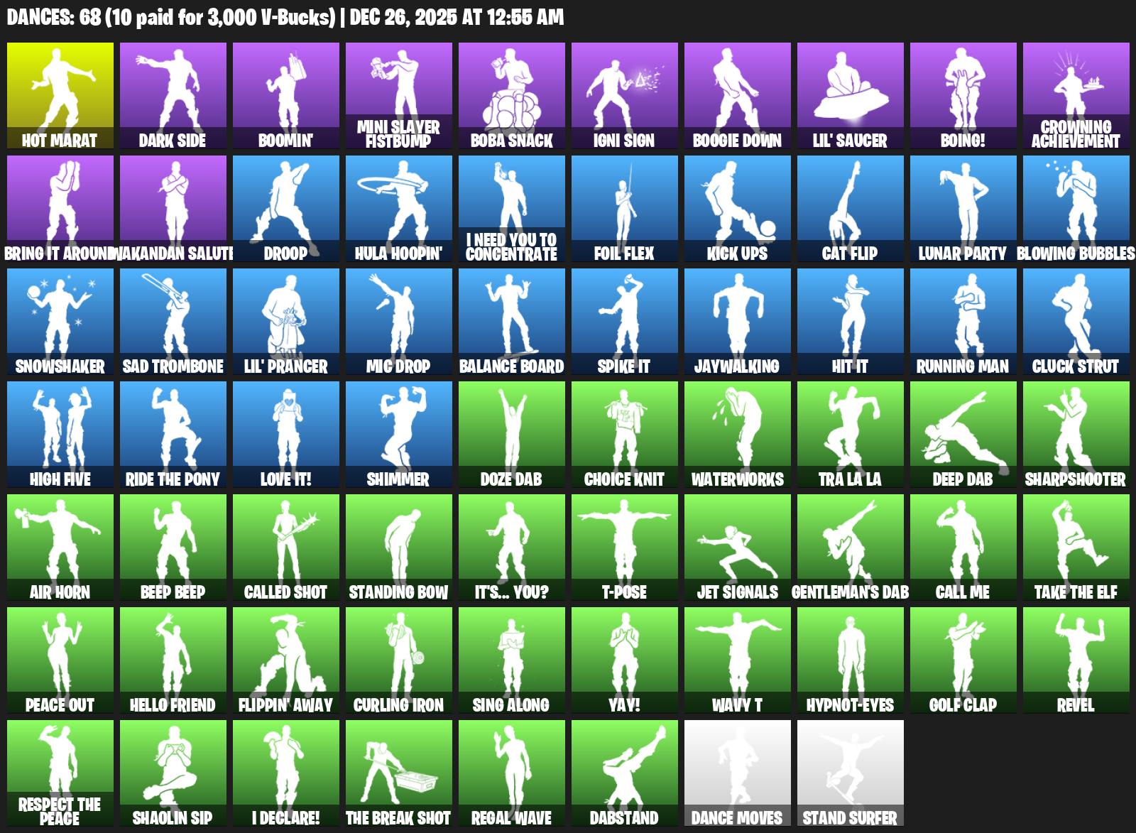 Hot Marat, Dark Side, Boomin’, Mini Slayer Fistbump, Boba Snack, Igni Sign, Boogie Down, Lil’ Saucer, Boing!, Crowning Achievement, Bring it around, Wakandan Salute, Droop, Hula Hoopin’, I Need You to Concentrate, Foil Flex, Kick Ups, Cat Flip, Lunar Party, Blowing Bubbles
