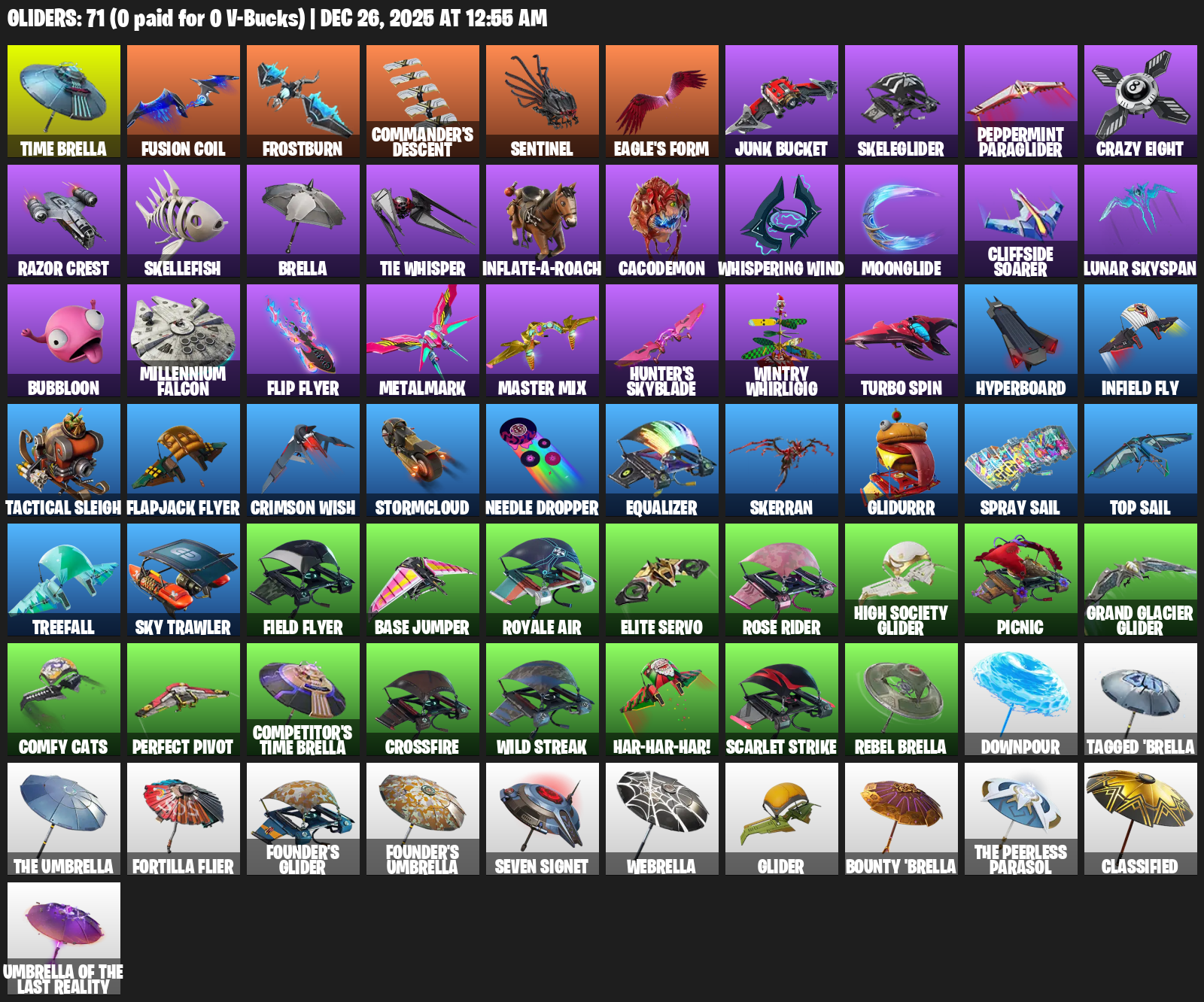 Time Brella, Frostburn, Commander’s Descent, Eagle’s Form, Junk Bucket, Skeleglider, Peppermint Paraglider, Crazy Eight, Razor Crest, Skellefish, TIE Whisper, Inflate-A-Roach, Cacodemon, Whispering Wind, Moonglide, Cliffside Soarer