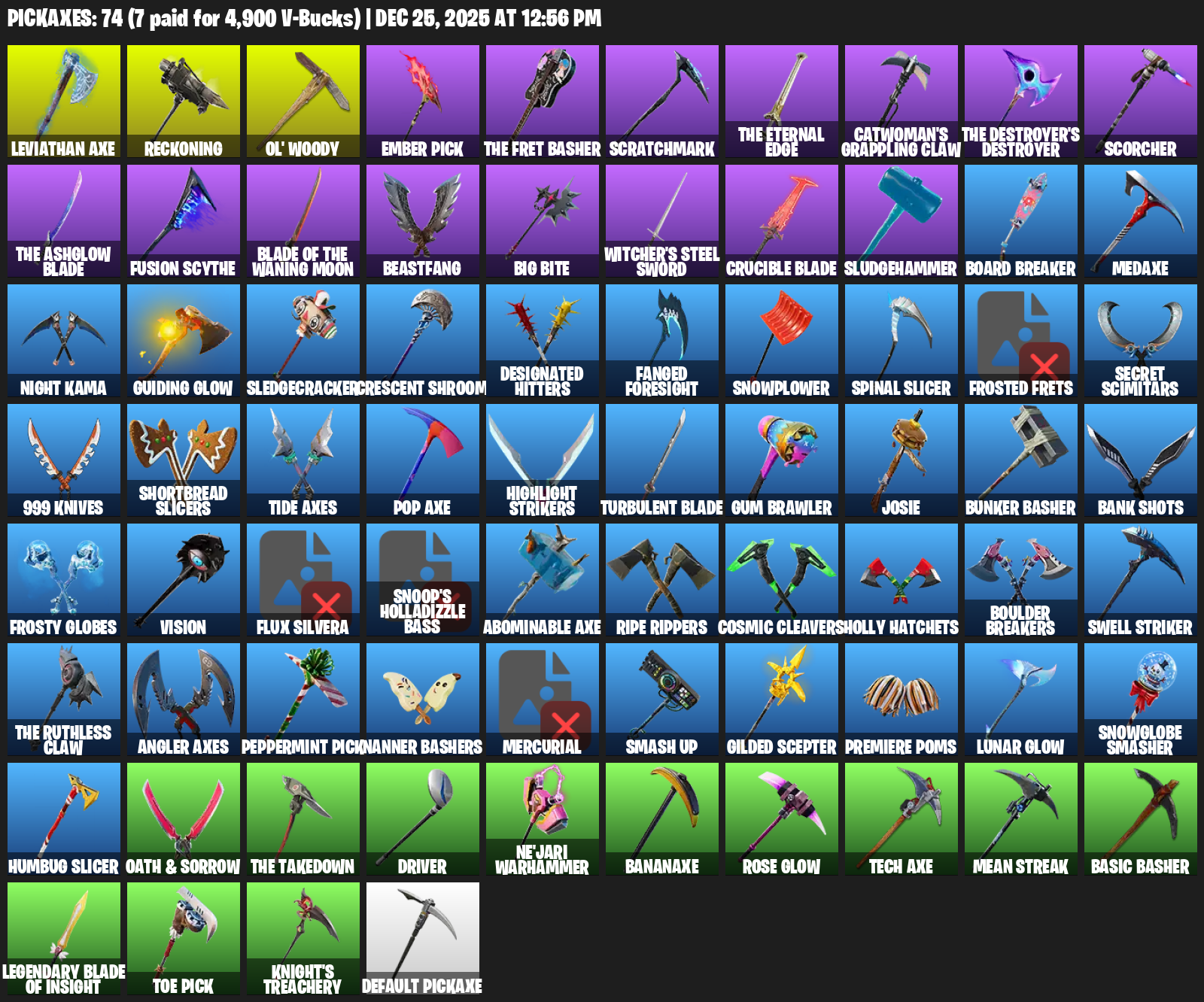 Leviathan Axe, Reckoning, Ol’ Woody, Ember Pick, Scratchmark, Catwoman’s Grappling Claw, Scorcher, Beastfang, Big Bite, Witcher’s Steel Sword, Crucible Blade, Sludgehammer, Board Breaker, Medaxe